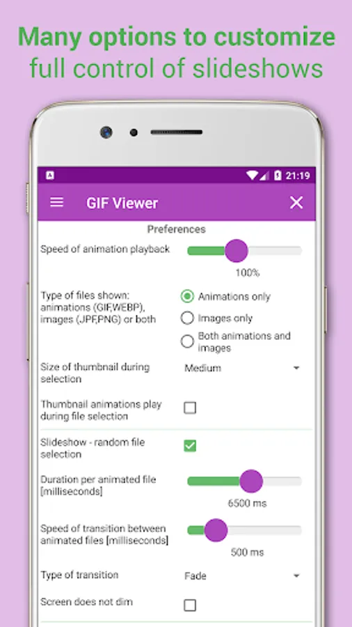 ✔ Also play .JPG and .PNG images. You can choose to mix animations and pictures in your slideshow. Or select images only.