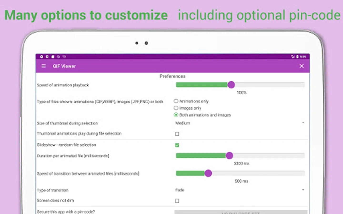✔ Second pin-code to share animations with friends.If you secure Gif Viewer with a pin-code, the app generates a second pin-code, giving access to a separate folder in app memory. Here you can import animations that you want to show your friends, while your private GIF and WEBP files are totally invisible.