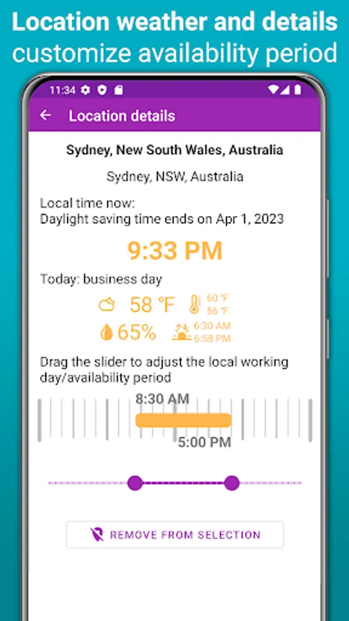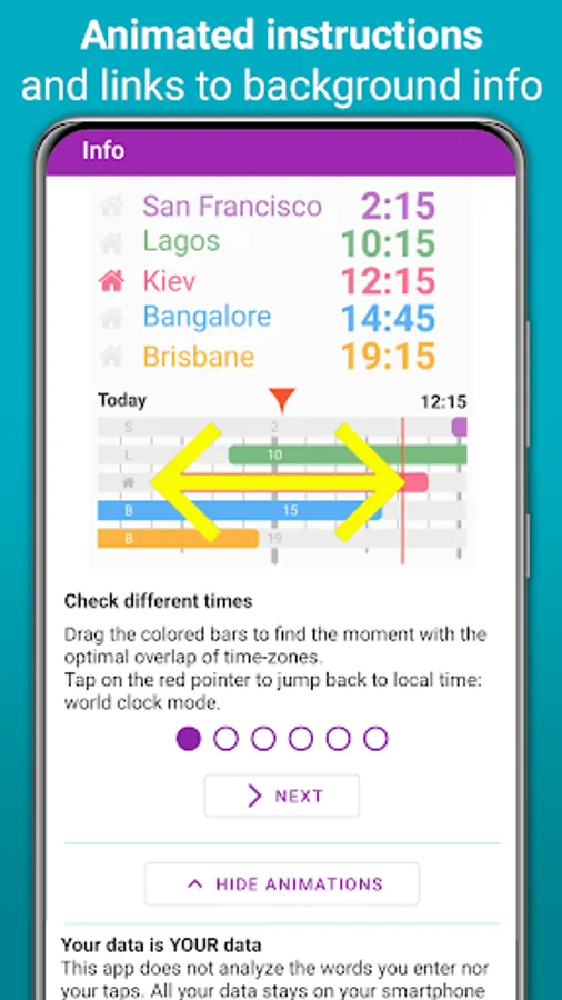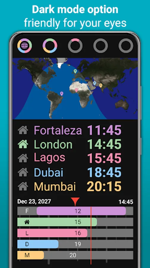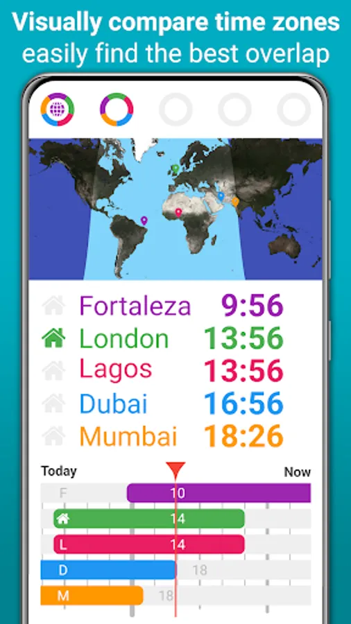 This unique and free visual world clock and time zone comparison app helps you: