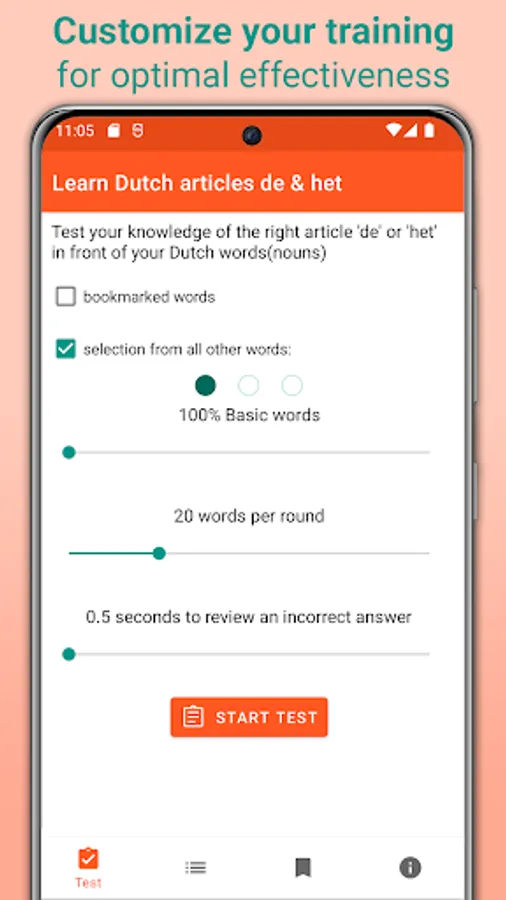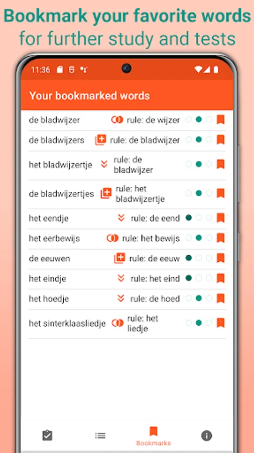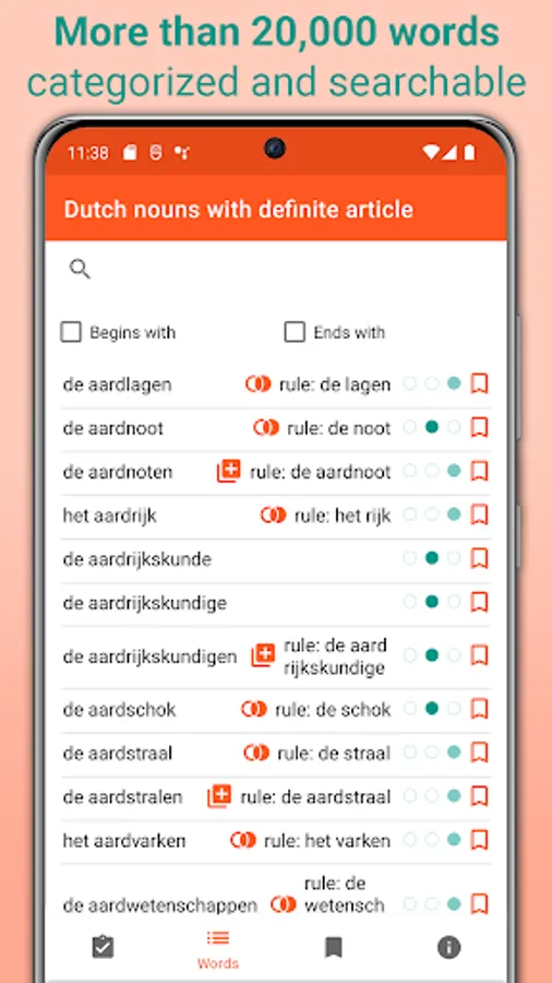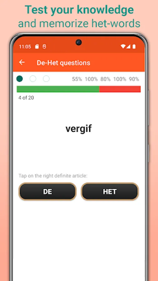Educate yourself with help of the most relevant 20,000 Dutch nouns in the database, which are checked against the latest official spelling and grammar rules by a native speaker from the Netherlands. Due to its large database, covering all common Dutch nouns you will encounter in everyday or business conversations, this app does not need an internet connection to function.