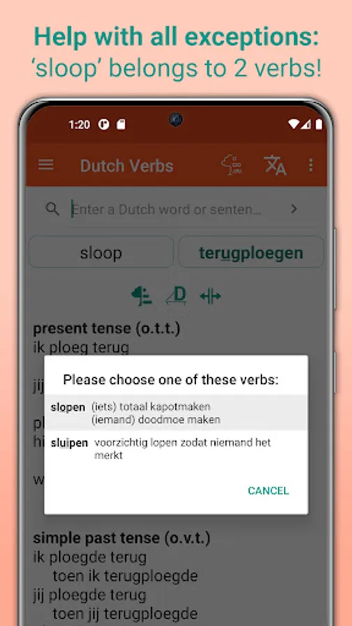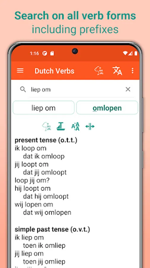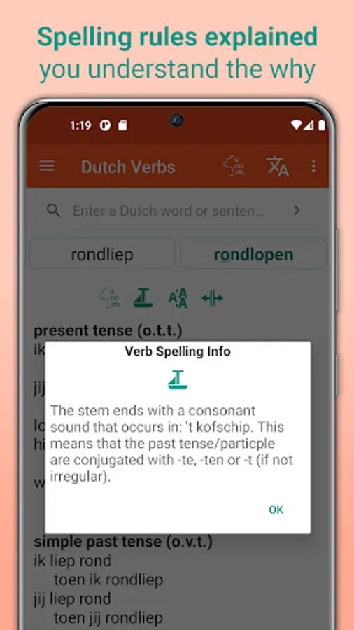 No more sloppy spelling -d, -t or -dt errors when you conjugate verbs in the Dutch language. Easily check the complete spelling of every Dutch verb on your mobile.
