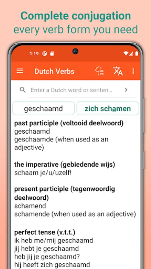 For each Dutch verb you get a complete overview of all forms or conjugations: