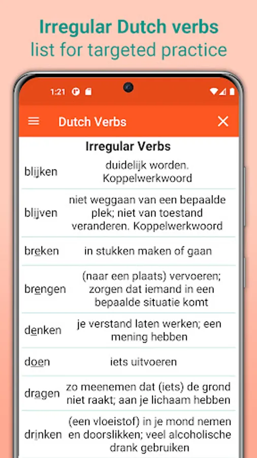 This app knows all official Dutch spelling rules and every exception in the conjugation of the over 600 irregular ('sterke') verbs in the language spoken in the Netherlands and Belgium (Flanders/Vlaanderen). The built in list of 11,000 verbs also includes all commonly used regular ('zwakke') verbs, so this app does not need an internet connection to help you improve your spelling of Dutch verbs.