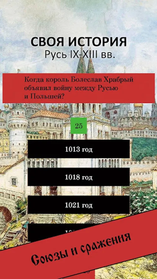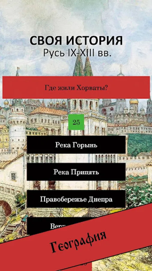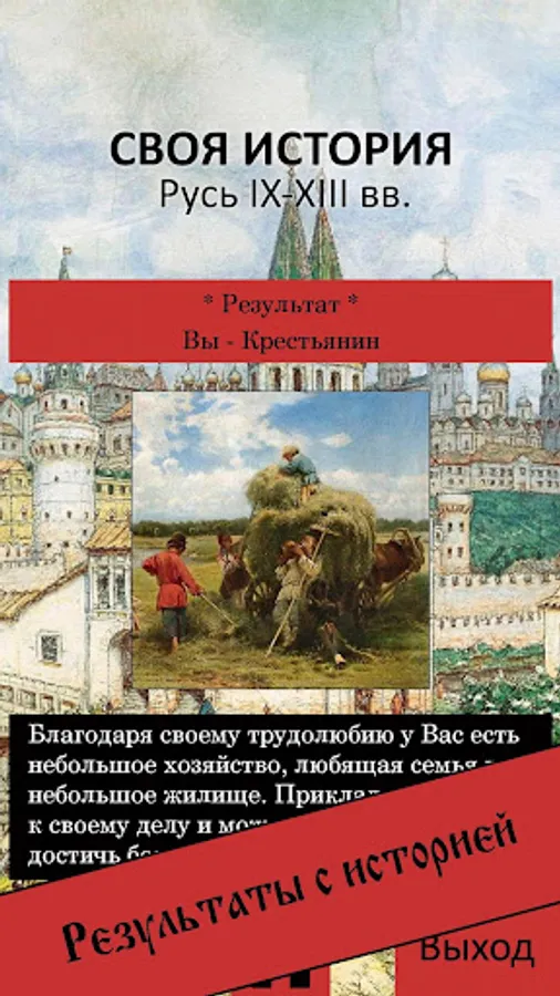 The test has a unique education system, so that the study of the history of ancient Russia becomes easy and fast. And the answers to the tests were interesting - there is a level of complexity of issues that appear at random, making the passage of the re-test various content issues. Questions can be both the most simple, as the vernacular and historical dates greatest battles or princes activities.