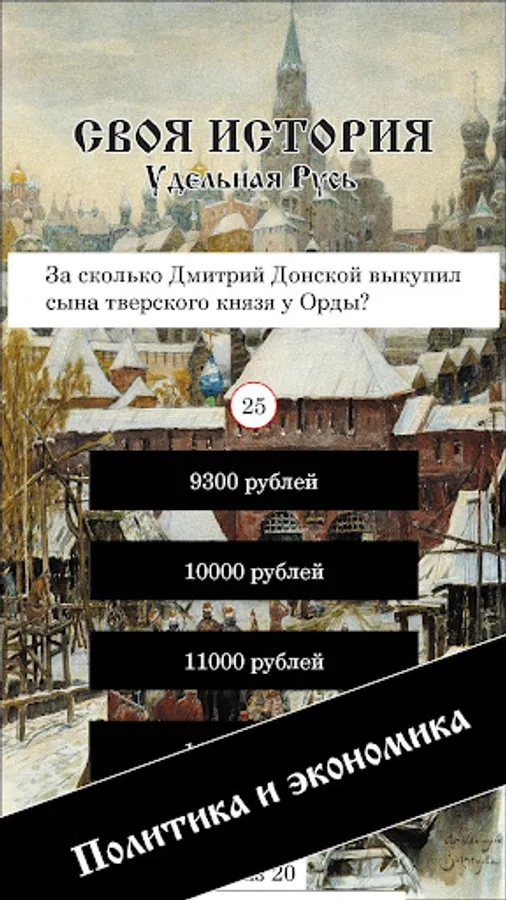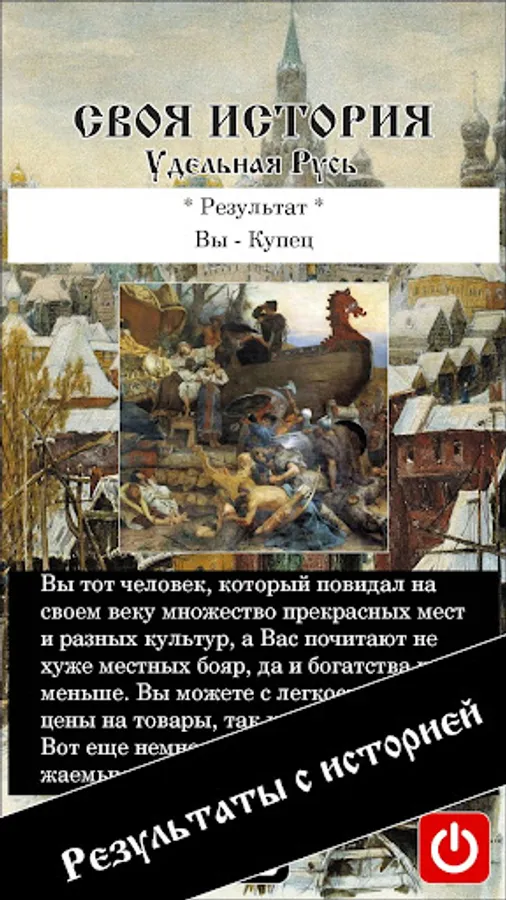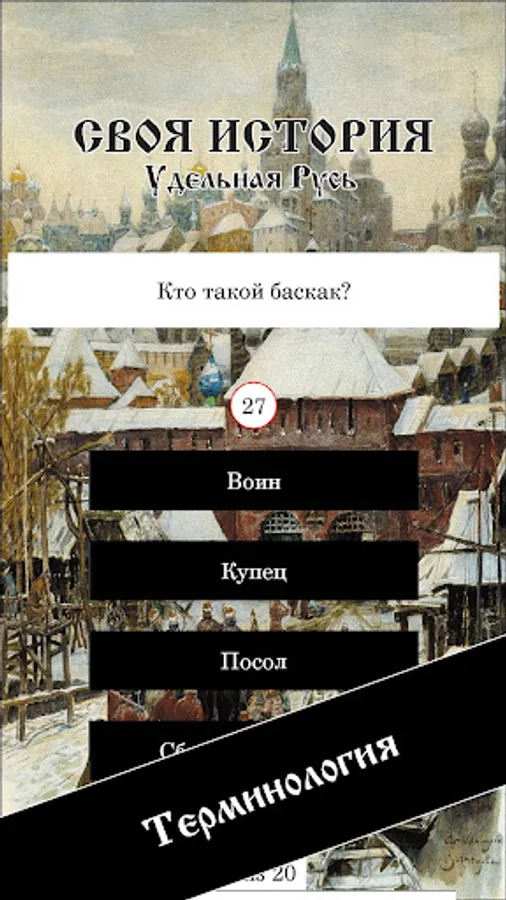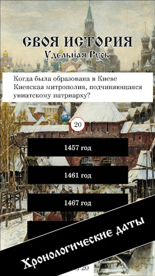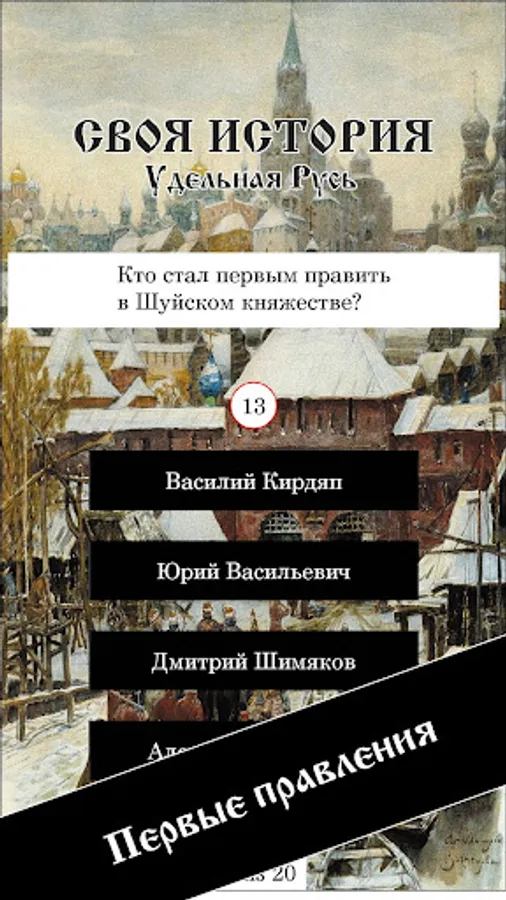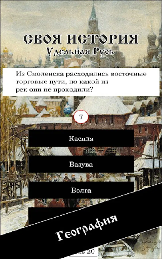 The test has a unique education system, so that the study of history Udelnaya Russia becomes easy and fast. And the answers to the tests were interesting - there is a level of complexity of issues that appear at random, making the passage of the re-test various content issues. Questions can be both the most simple, as the vernacular and historical dates greatest battles or princes activities.