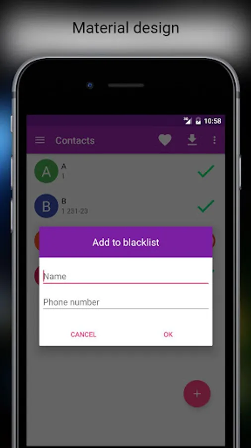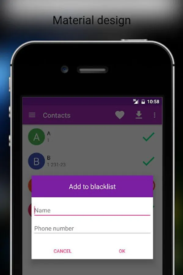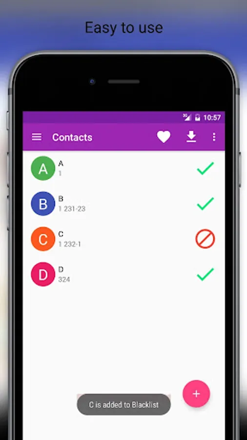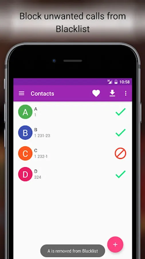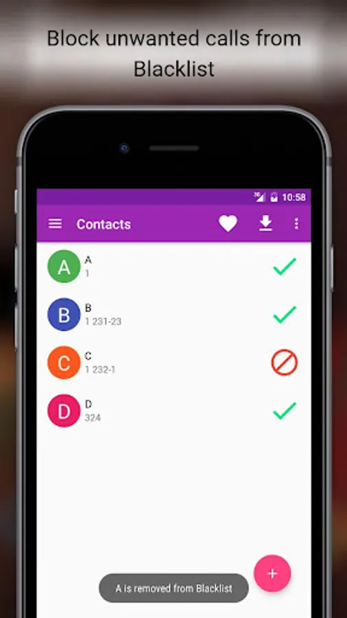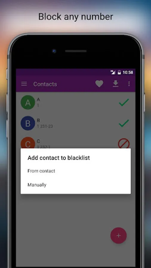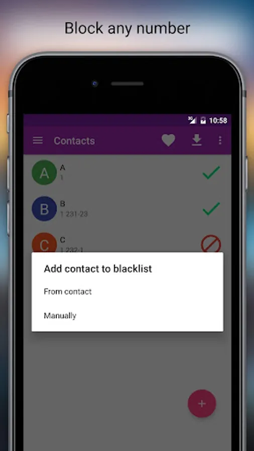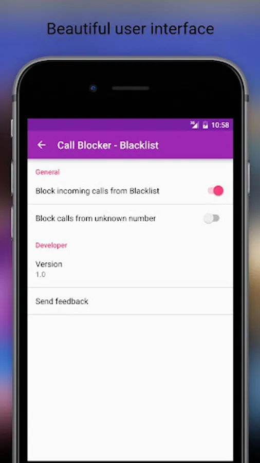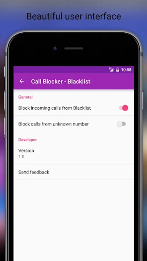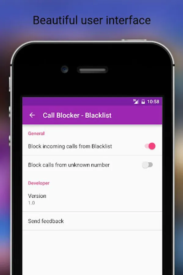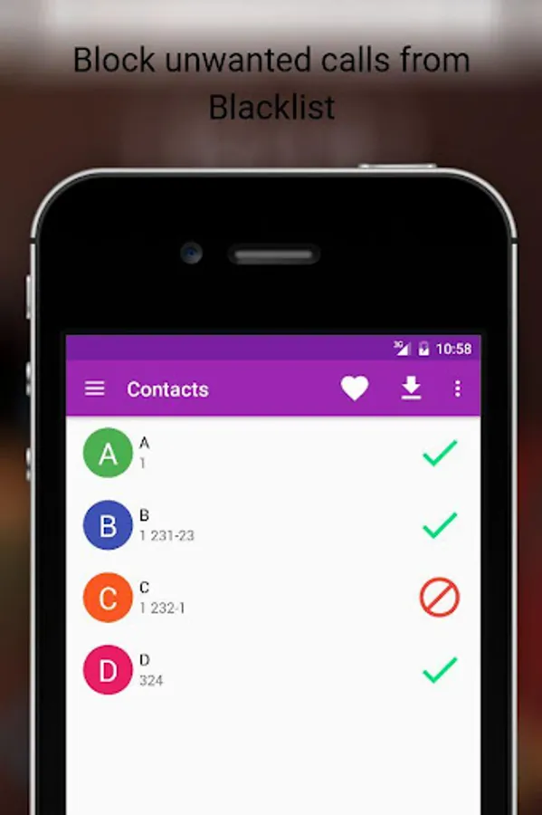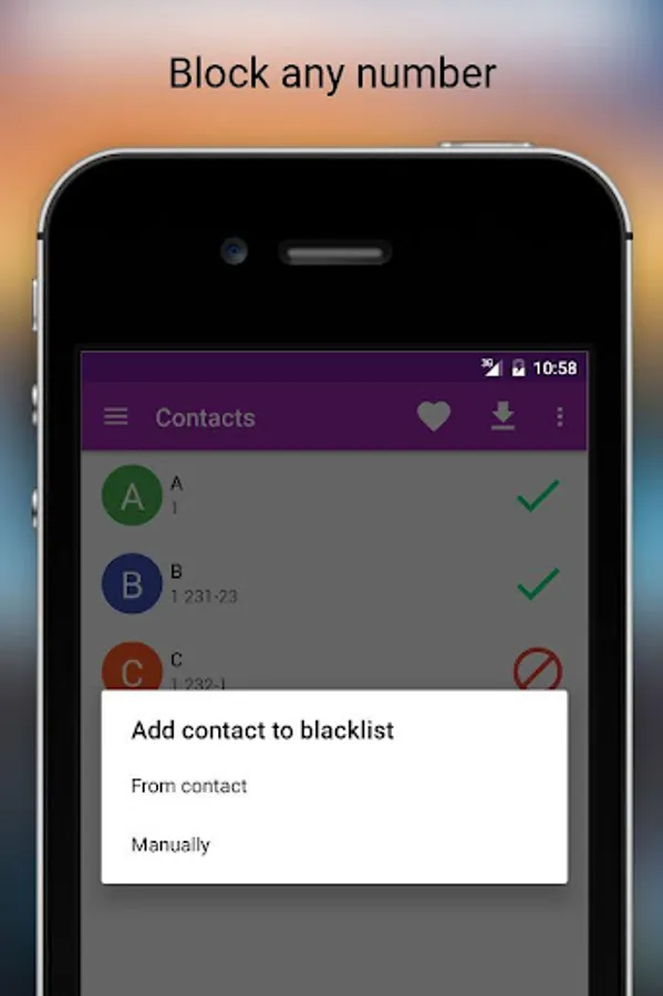 This is the best app for blocking calls from any number that you don't want to answer. It's simple and easy to use. You can add any number into the Blacklist or you can choose contact from your phone. Then any call initiated from these numbers will be blocked immediately. The callers will not know that you are blocking them, they can only guess that you are busy.