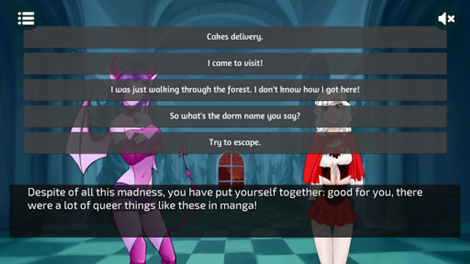 A young (but in age of consent!) girl found herself in the infernal dormitory amongst the monster guys. A dating simulator came true for her? Will she tame a werewolf, seduce a demon or will she be bitten by a vampire? Or else instead of datings, there's a fate of steak waiting for her?