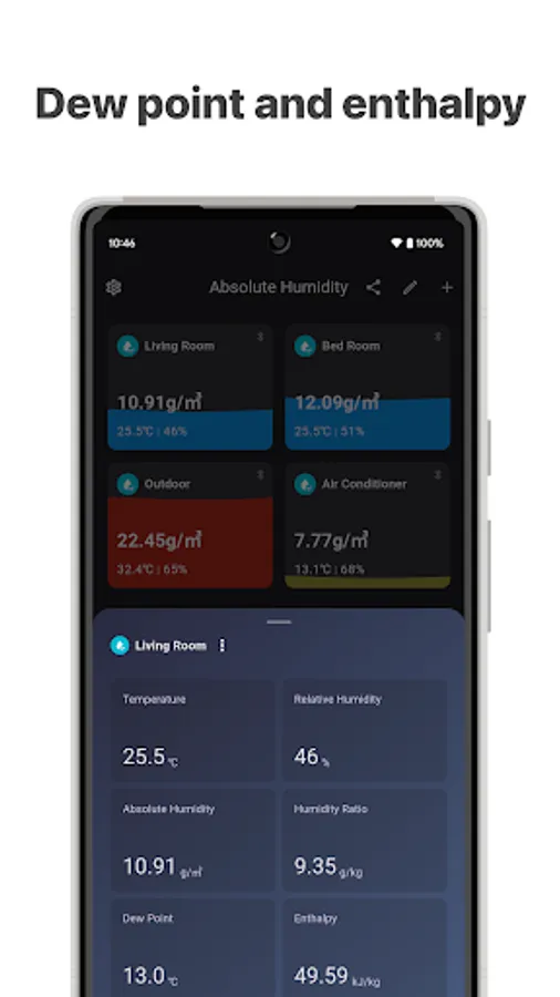 “Absolute Humidity” is an application that calculates and displays absolute humidity using temperature and relative humidity data obtained from a thermohygrometer. It is designed so that the comfort level can be understood at a glance with numerical values and visuals.