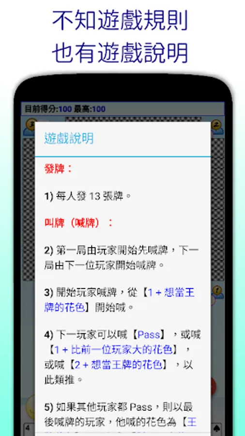 5) If all other players pass, then the player who called the last card, the suit he called is [trump card suit], and must work together with [opposite players as a group] to collect [number of cards + 6]. be a winner.