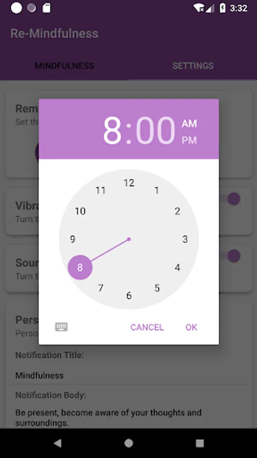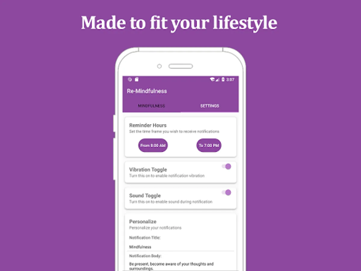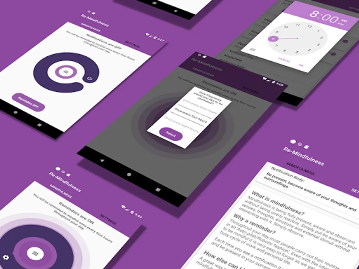 Re-Mindfulness will remind you at your selected frequency to be mindful and pause for a moment to notice your emotions, environment and senses. This can help improve decision making by stopping you acting on impulse alone and elevate your mood throughout your day by promoting a more stable state of mind.