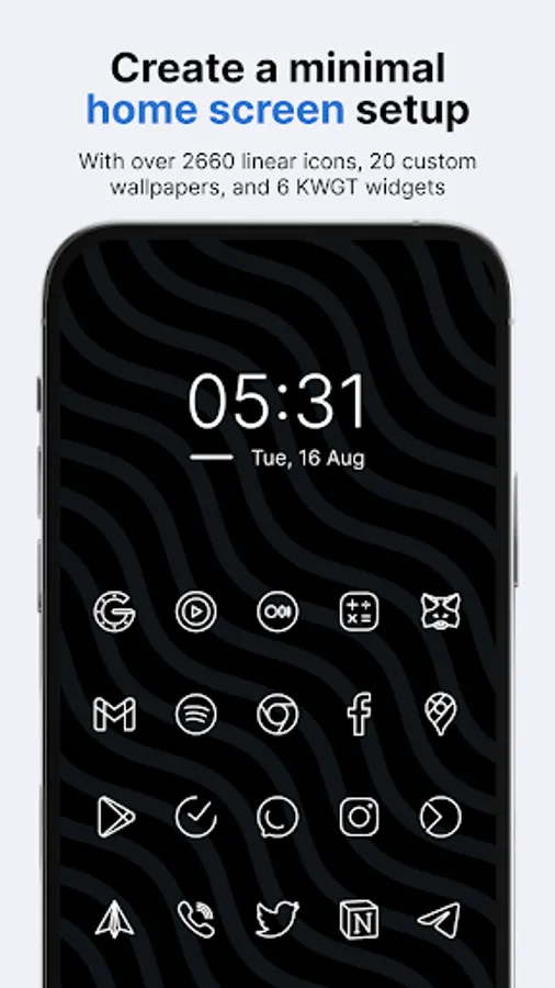 Caelus White icon pack has 3234 icons, 20 custom wallpapers, and 6 KWGT widgets, so it’s all you need to personalize your phone how you like it. For the price of one app, you get content from three different apps. Caelus White icons are linear, color is 100% white, so it goes well with colorful, dark, and amoled wallpapers. Caelus White icon pack is made on a 24x24 px grid with 1 px line thickness, with special attention to size for every icon, so you don't have to worry about the size or line thickness consistency. *To apply KWGT widgets, you need KWGT and KWGT Pro apps.