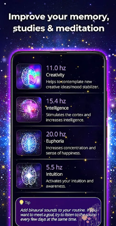 Binaural beats is a very complete application of binaural sounds that you can use as binaural therapy to improve your memory, intelligence, concentration, meditation, sleep and relaxation among many other things.