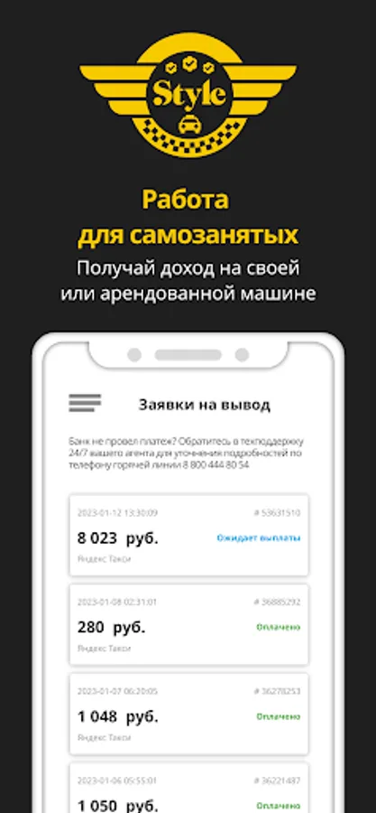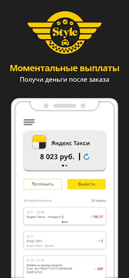 The Style Taxi Depot app is a handy tool for taxi drivers. To cooperate with Yandex.Taxi and withdraw earned funds, now you do not need to visit offices - just download our application and withdraw money at any time convenient for you in just 2 clicks!