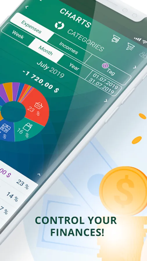 - Analyze your expenses and incomes with the help of user-friendly charts.