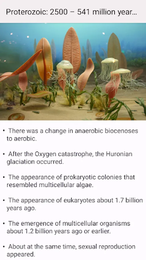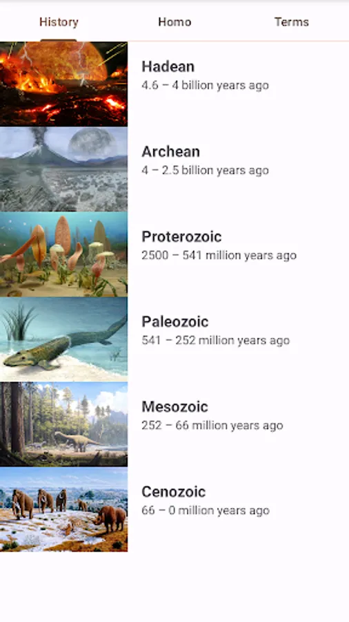 The history of the evolution of life on Earth is divided into four eons: Hadean, Archean, Proterozoic, and Phanerozoic. Phanerozoic includes three eras: Paleozoic, Mesozoic, and Cenozoic. Over 4 billion years of evolution, many simple organisms, complex plants and animals have appeared.