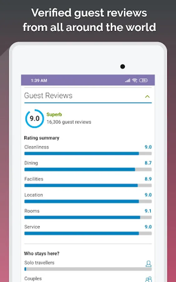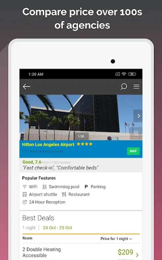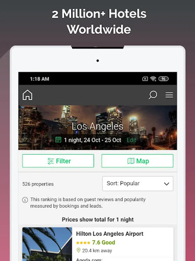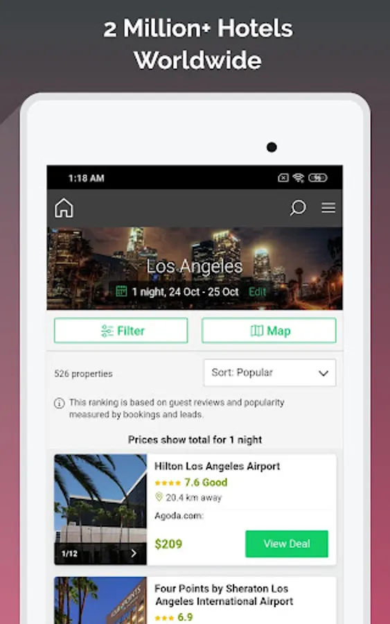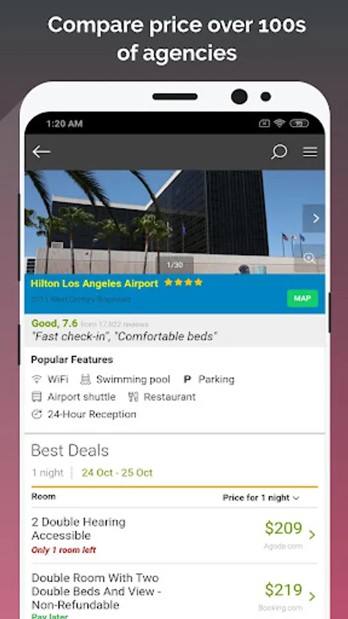 Hotel Booking App helps you to search hotels from 100s of websites and find the perfect low-cost hotel. We search all leading travel websites for you which includes agoda, booking com, laterooms, lastminute, zenhotels, scooh, hotels tonight and many more are there in this list. So you can confirm the lowest price for your hotel reservation. Our app includes many budget hotels and hostels worldwide for solo travelers.