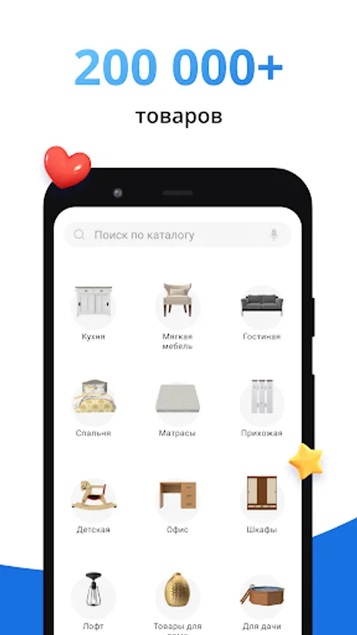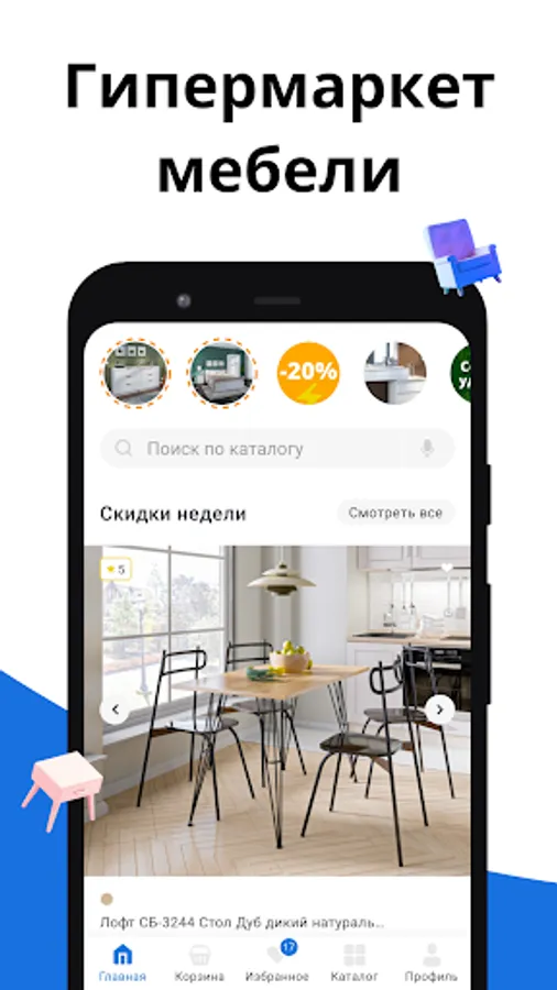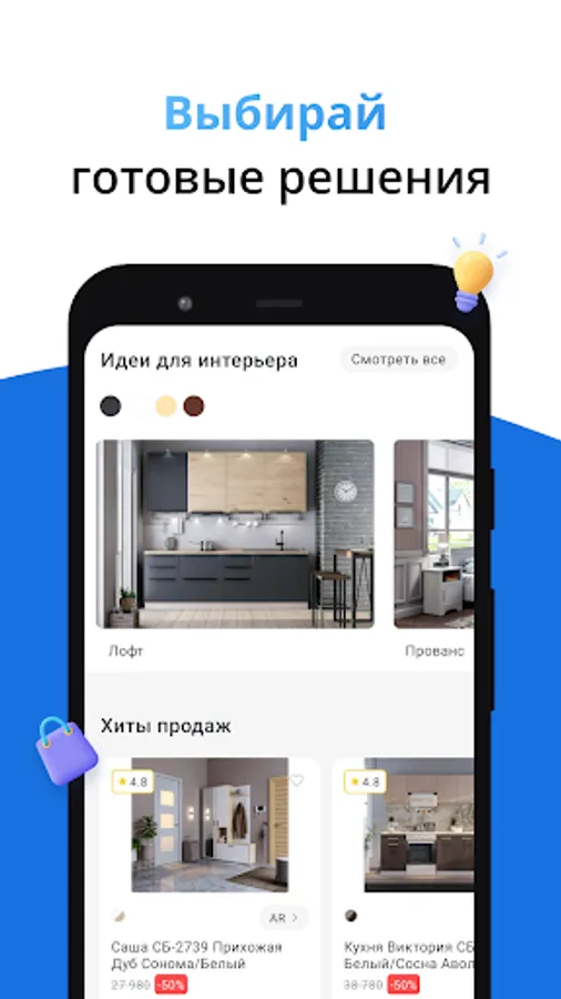 Here you will find EVERYTHING you need to create a cozy and functional home or cottage! Modular kitchens, living rooms and bedrooms, low-cost ready-made solutions for the entire apartment, beds and mattresses, appliances and home goods - all this can be tried on at home using the AR virtual reality function.