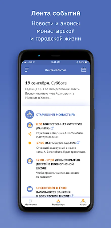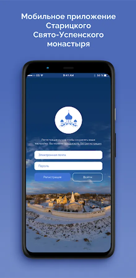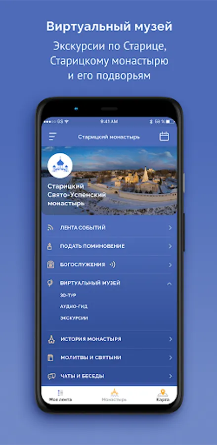The multifunctional mobile application "Staritsky Holy Dormition Monastery" was developed by the Creative Association "Parsuna" (https://parsuna.ru/) at the request of the Foundation for the Revival of the Staritsky Holy Dormition Monastery.