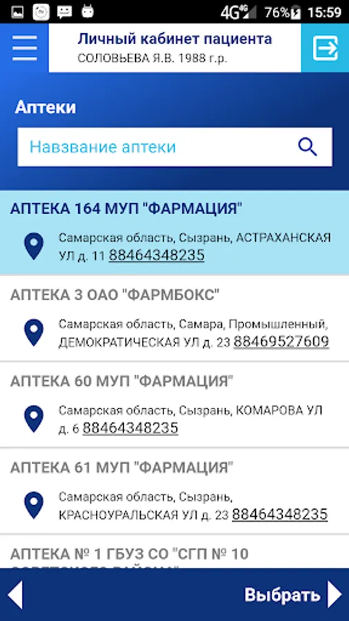 - view reference information about medical institutions and pharmacies of the Samara region (addresses, phone numbers and additional information)