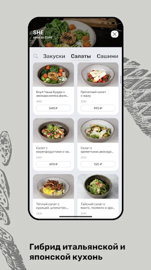 SHE stands for Wellbeing Bistro. The restaurant's cuisine can be described as Mediterrasian - a hybrid of Italian and Japanese. Here, every detail is aimed at achieving a state of wellbeing - a sense of harmony with everything that surrounds our every day and is an integral part of life. The SHE restaurant encourages you to become a more conscious, ethical and environmentally friendly person.