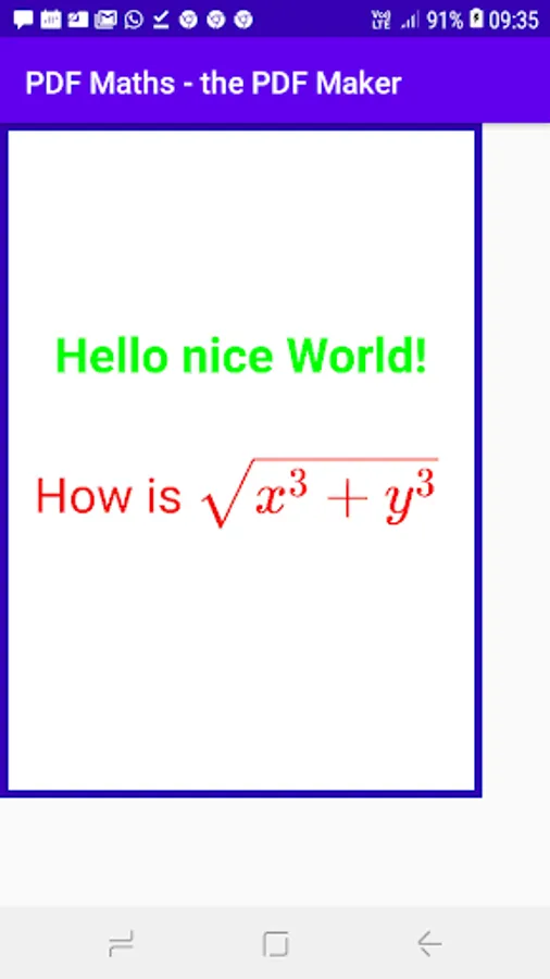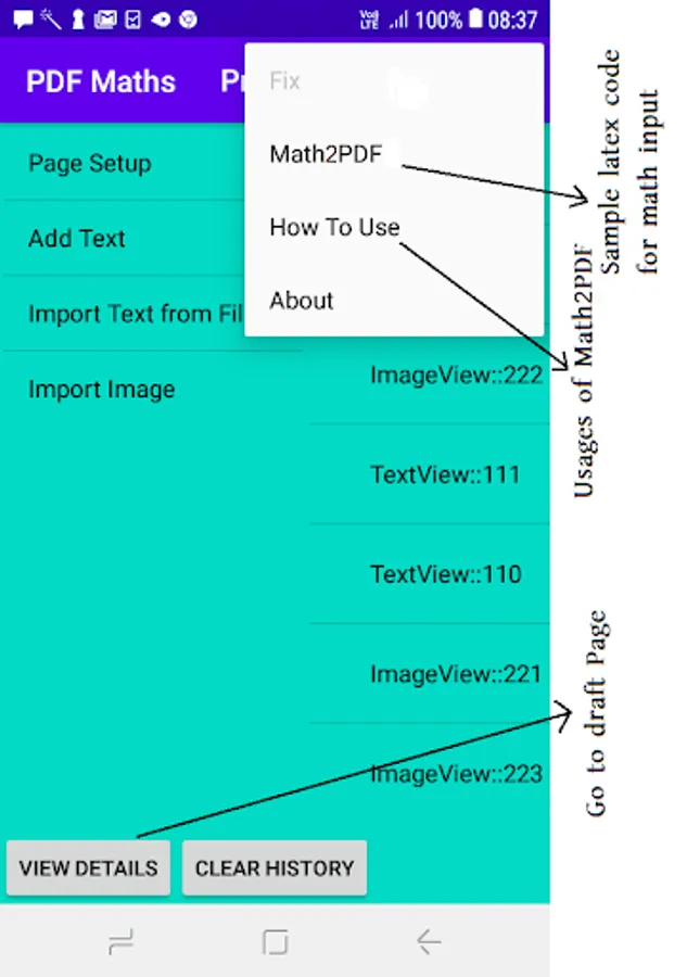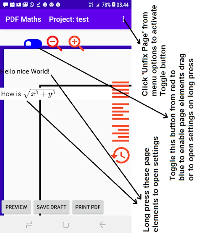 With PDF Maths you can create PDF documents out of your math input, text and images. You can use latex code inside the text input to display math symbols, formulea & equations. You can import text (.txt) file or graphs, charts in the form of jpg images from your android set's internal memory. You can reposition the elements on the draft page by dragging them on it. Activate drag by long pressing the element when Toggle button is on. You can access this Toggle button when the page is in 'Unfix Page' mode. You can also use the different align buttons (Center Align, Left Align & Right Align) to rearrange elements on the page. Your work will be auto saved when you leave the page. On opening an existing page, initially the page (draft) will be in 'Fix Page' mode. To modify the the elements we first need to do 'Unfix Page' from drom down menu on the Action bar. Finally the PDF page will be generated on clicking 'PRINT PDF'. The PDF, thus generated will be stored the OUTPUT folder of the Math2PDF directory of your internal storage. The project name will be the file name of the generated PDF file.