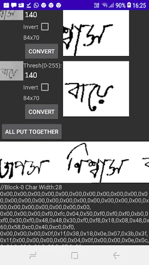 Your put text in any language on this P10 dmd. This Android app takes any image, converts it in to grayscale mode. Then the upon the selected cropped image it makes four equal parts. Converts each part to black & white mode with a user given threshold value. Then it joins these image parts and generates the hex code.