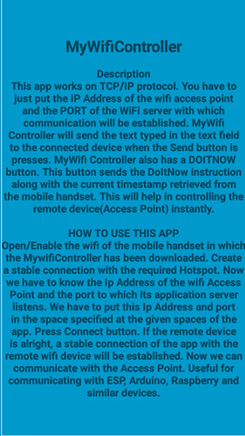 MyWifiController also has a DOITNOW button. This button sends the DoItNow instruction along with the current timestamp retrieved from the mobile handset. This will help in controlling the remote device(Access Point) instantly.