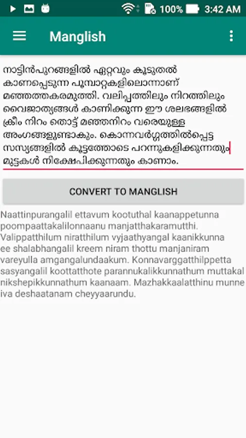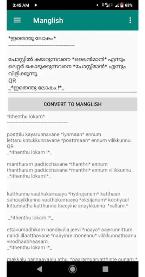 Translate or convert malayalam text to manglish. Useful for people who can't read malayalam, but understands it.