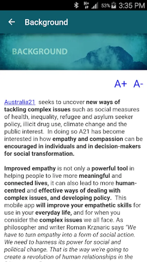 In this app by Australia21 you will be able to learn about empathy and the benefits it can bring to you (and your community), we will give you tips and exercises to help you learn to be more empathic.