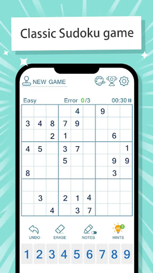 Classic Sudoku is a logic-based number puzzle game and the goal is to place 1 to 9 digit numbers into each grid cell so that each number can only appear once in each row, each column and each mini-grid. With our Sudoku puzzle app, you can not only enjoy sudoku games anytime anywhere, but also learn Sudoku techniques from it.