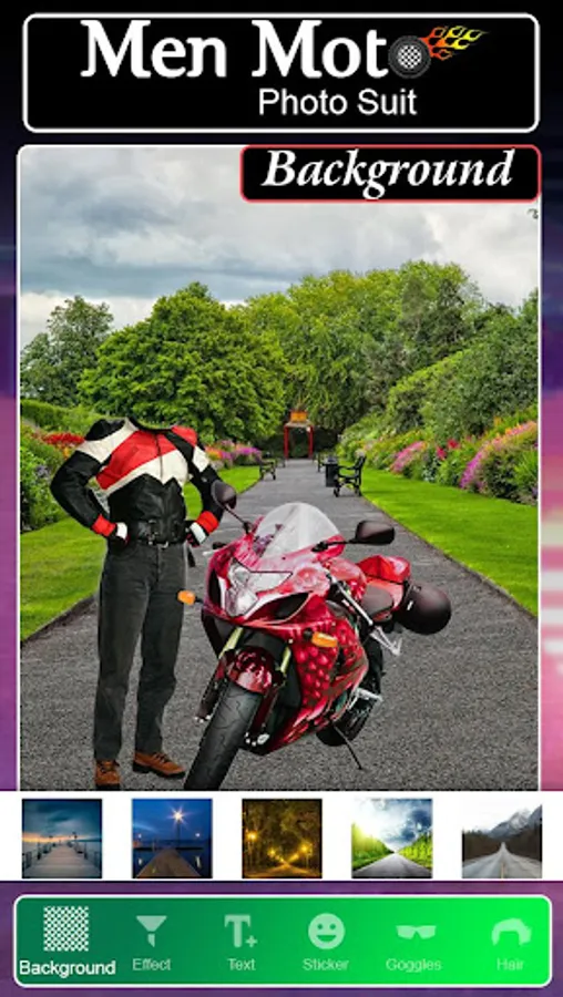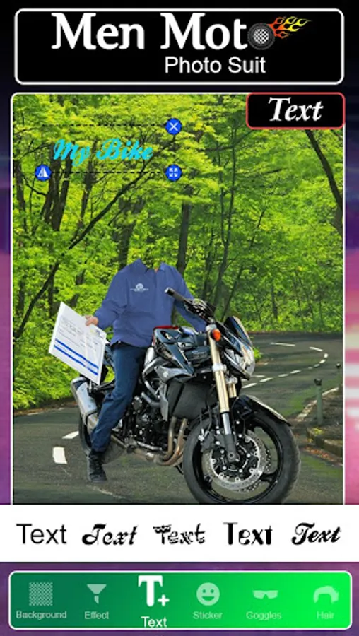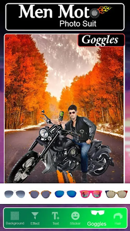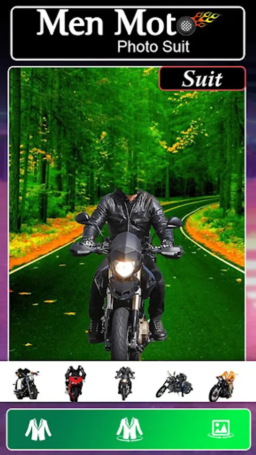 Men Moto Photo Suit is a photo editor app with man bike photo suits, background picture & stickers. It has a wonderful collection of different types other backgrounds. It has 35 backgrounds and 75+ different category stickers totally. It means fun is unlimited in this app.
