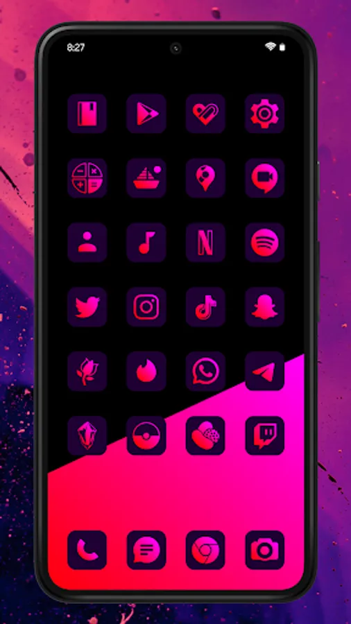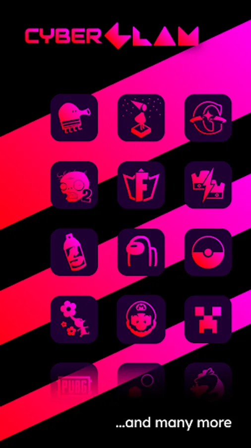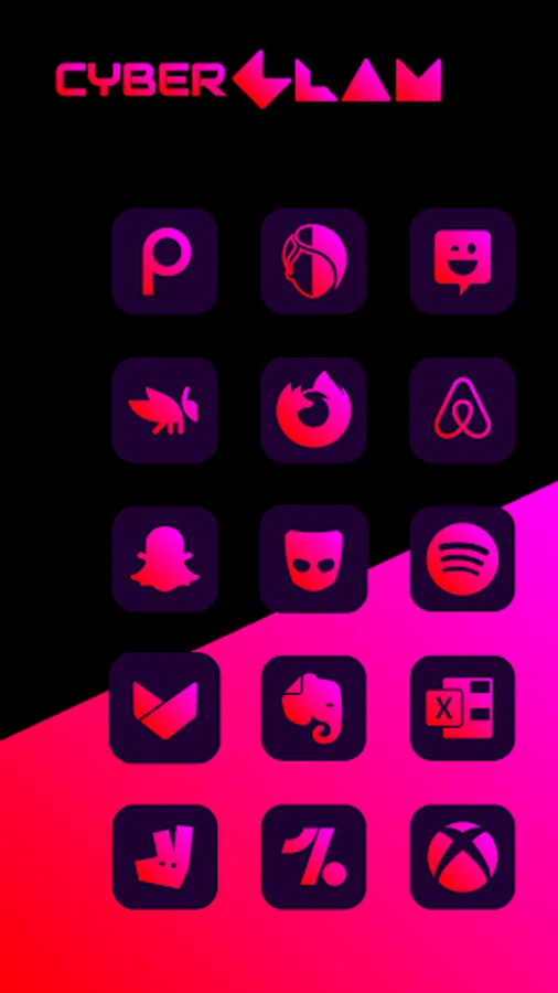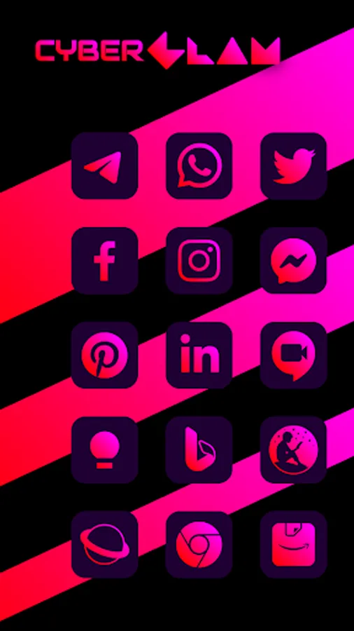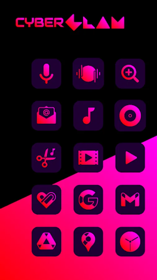 Give your smartphone's home screen a cool look with CyberGLAM: a set of cyberpunk red-fuchsia on dark purple background icons for your apps and games!