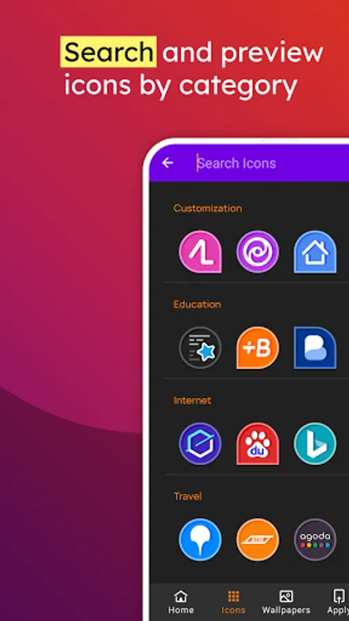 ★ Search and preview the available icons by category: Communication, Entertainment, Gaming, Social, Tools, Travel, Apple iOS and more.