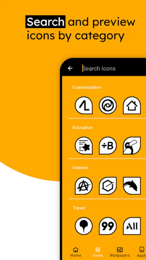 ★ Search and preview the available icons by category: Communication, Entertainment, Gaming, Social, Tools, Travel, Apple iOS and more.