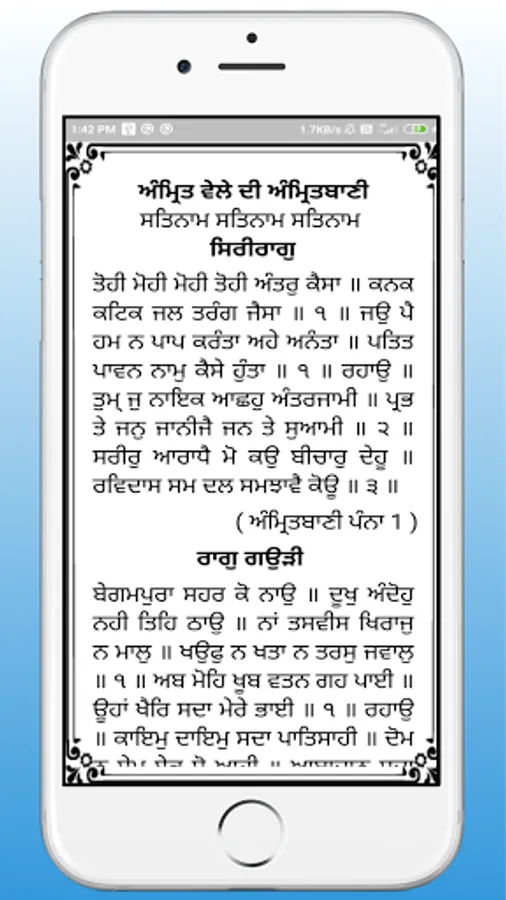 This app has two different sections - In first book, 9 baanis for reading and praise the God and second book contains 40 hyms of satguru ravidas ji those entered in shri guru Granth Sahib ji in 17 raags.