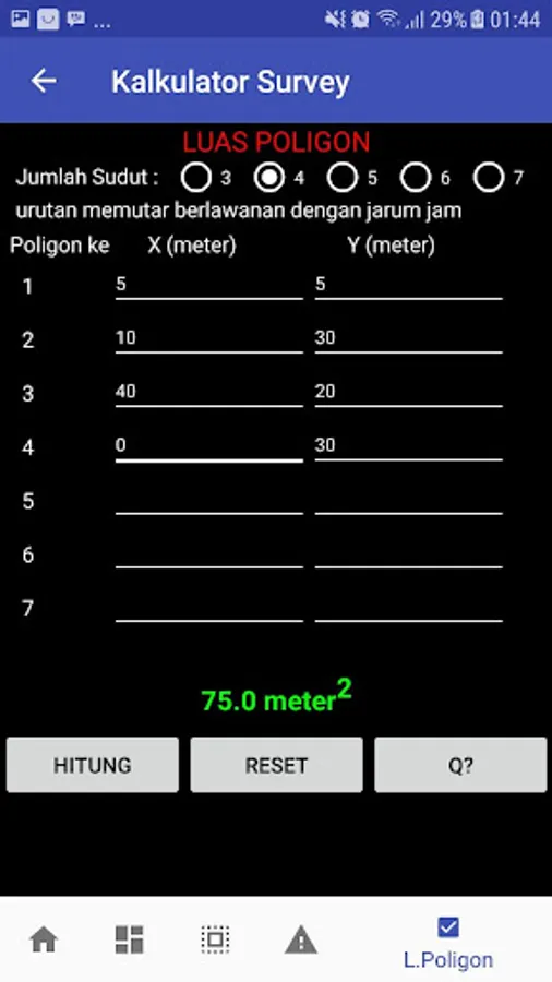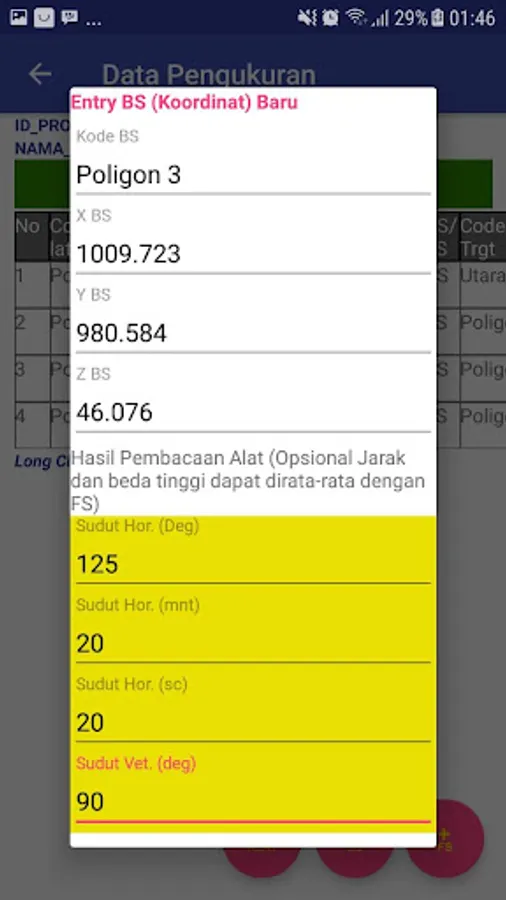 GeomatikaDroid application has features Practice Guidelines for Survey and Mapping 14 meeting, Kalkukator Survey, Nivo, Polygon and Topographic Survey Notes From the theodolite with the results of data such as Total Station can be downloaded to Excel (Unlimited Row).