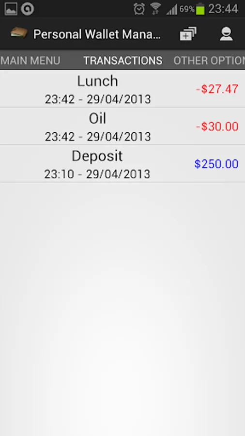 Keep your wallet under control with Personal Wallet Manager by viewing on what you spent money and when you did it, you can also put transactions in the future, so you will be able to see how much you have and how much you still have to pay