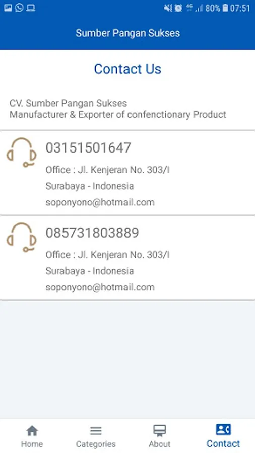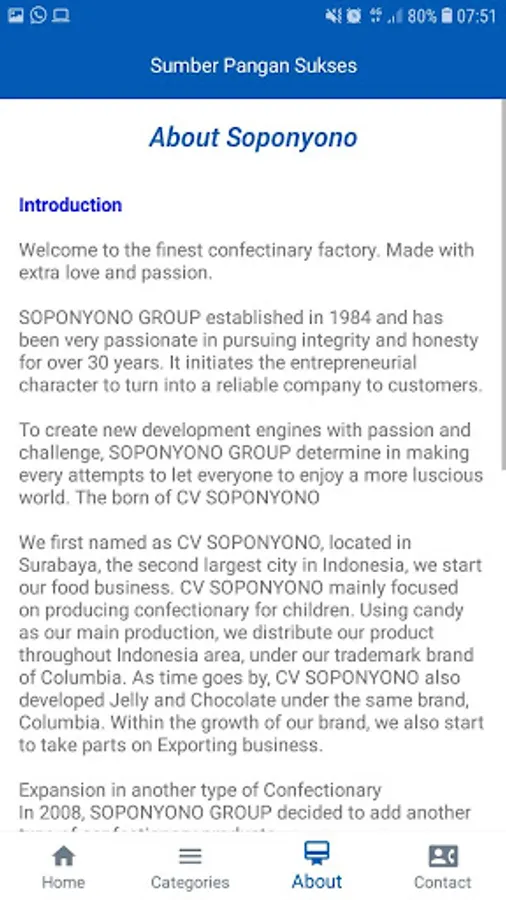 We first named as CV SOPONYONO, located in Surabaya, the second largest city in Indonesia, we start our food business. CV SOPONYONO mainly focused on producing confectionary for children. Using candy as our main production, we distribute our product throughout Indonesia area, under our trademark brand of Columbia. As time goes by, CV SOPONYONO also developed Jelly and Chocolate under the same brand, Columbia. Within the growth of our brand, we also start to take parts on Exporting business.