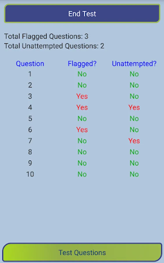 - Test summery is available that shows the flagged questions and unattempted questions.
