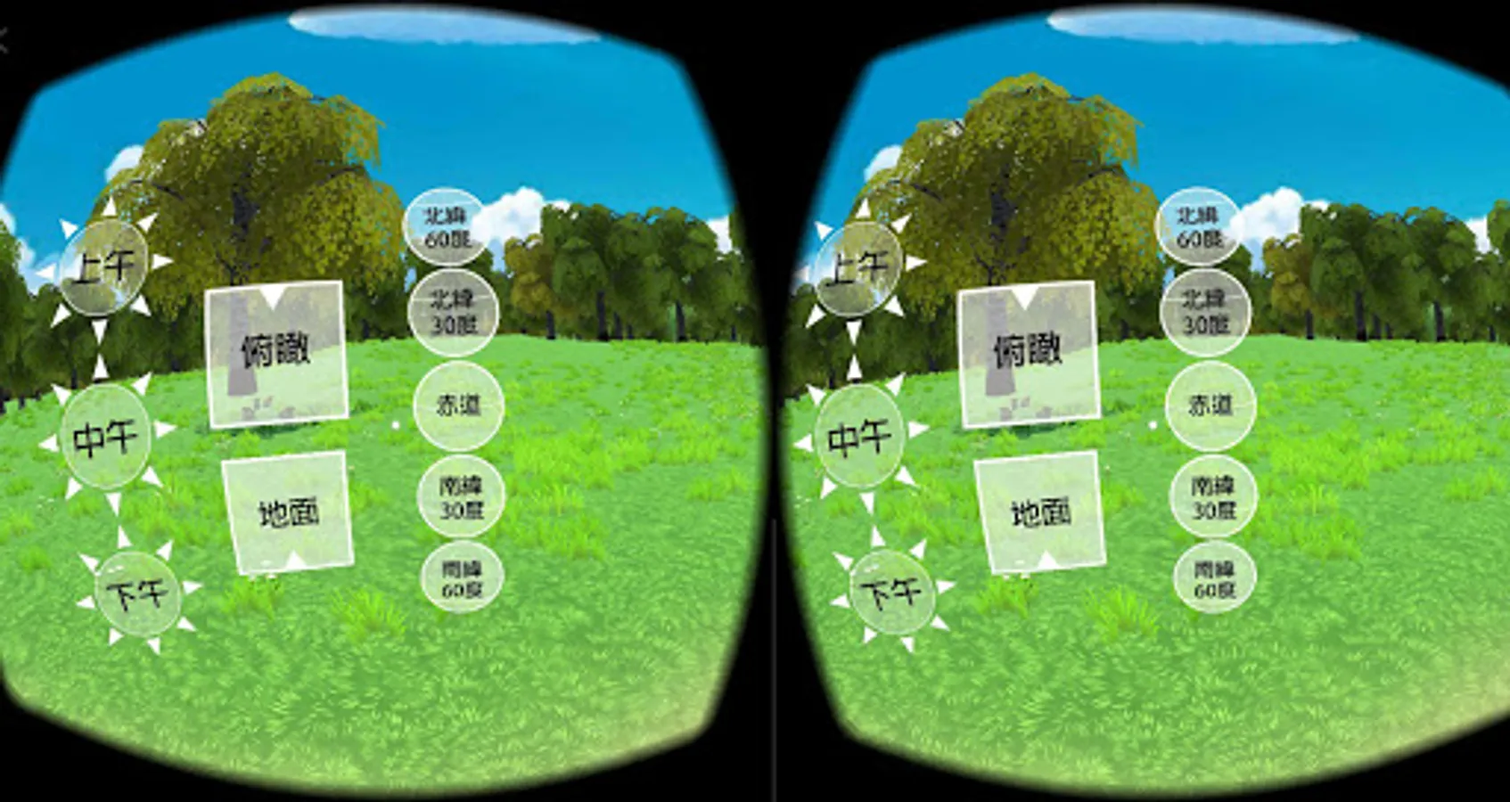 以VR場景模擬在不同的時間,不同的季節與不同的地方, 太陽的位置與產生影子的變化,讓學生能夠在模擬的環境中實際觀察到不同的現象