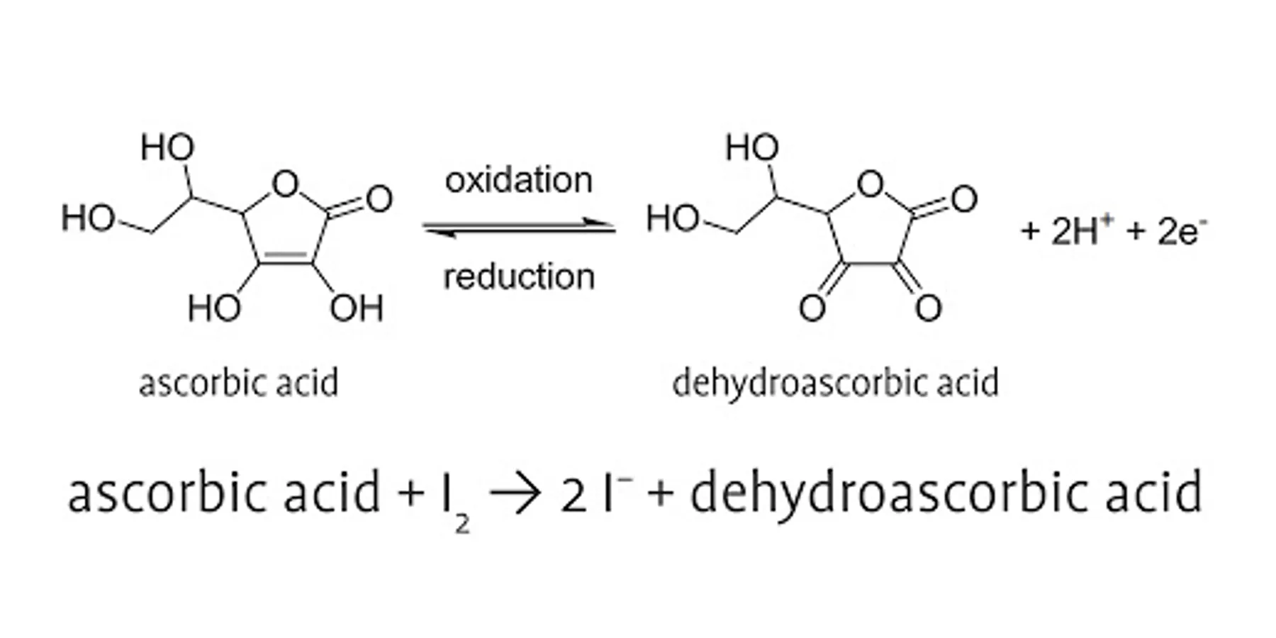 4. Vitamin C can reduce iodine to iodide ions. Iodine can make starch solution blue, while iodide ions can't make starch.