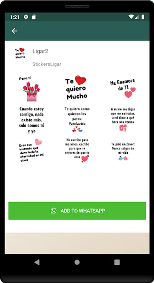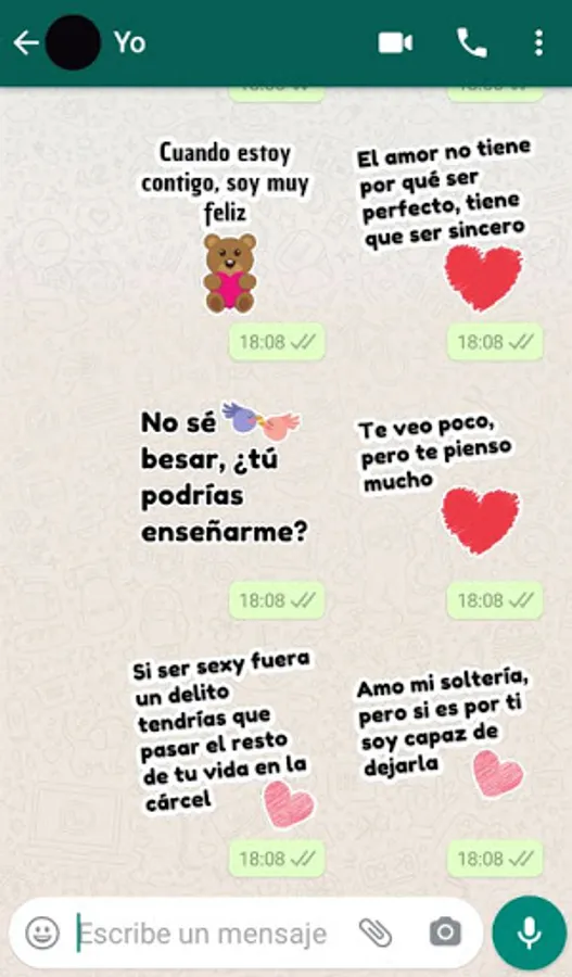 The application contains 2 packages with stickers with phrases to fall in love with. Each pack includes more than 7 different stickers.