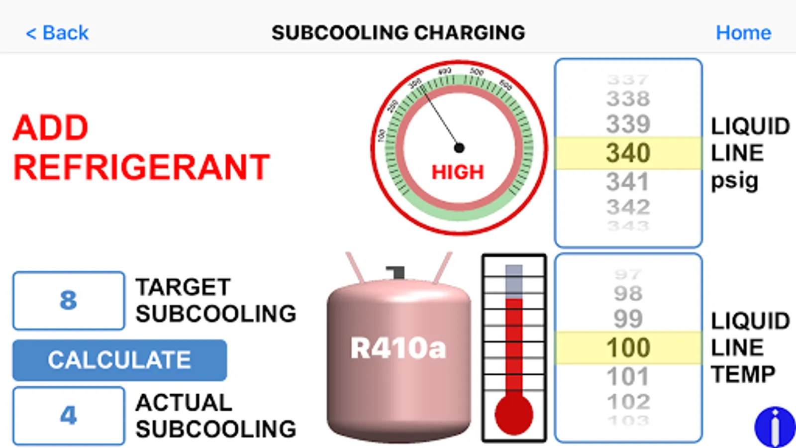 Superheat & Subcooling charging of all the popular refrigerants on the market with on screen corrective action including “add refrigerant” or “remove refrigerant” based on the specific conditions entered
