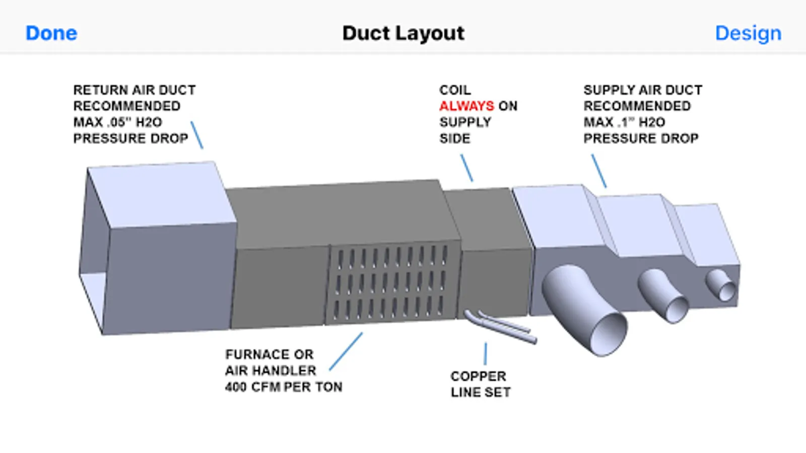 Duct sizing & layout calculator for flex, round metal, rectangular and oval