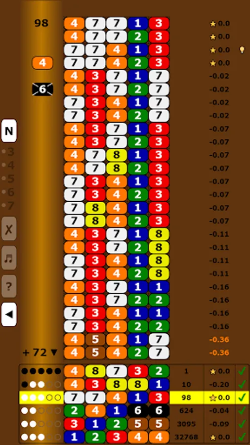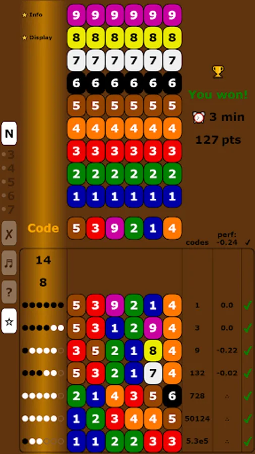 Several displays (with colors or numbers) and modes (from 3 to 7 columns and from 5 to 10 colors/numbers) are possible.