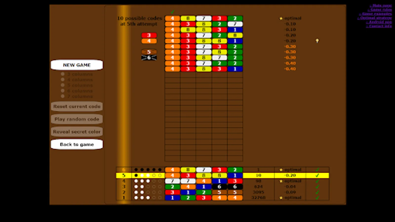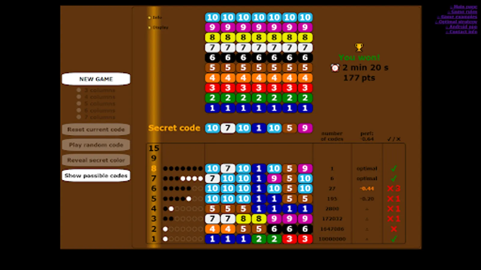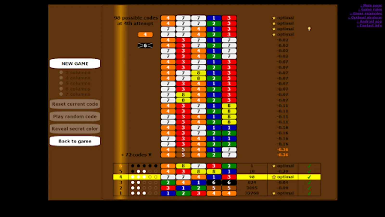 At each attempt, the number of possible codes is displayed, and the lists of possible codes are shown at game end.