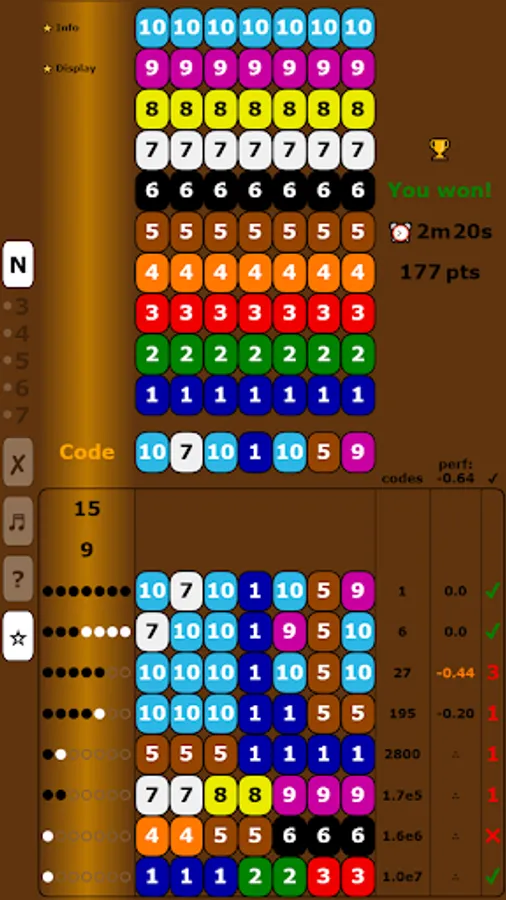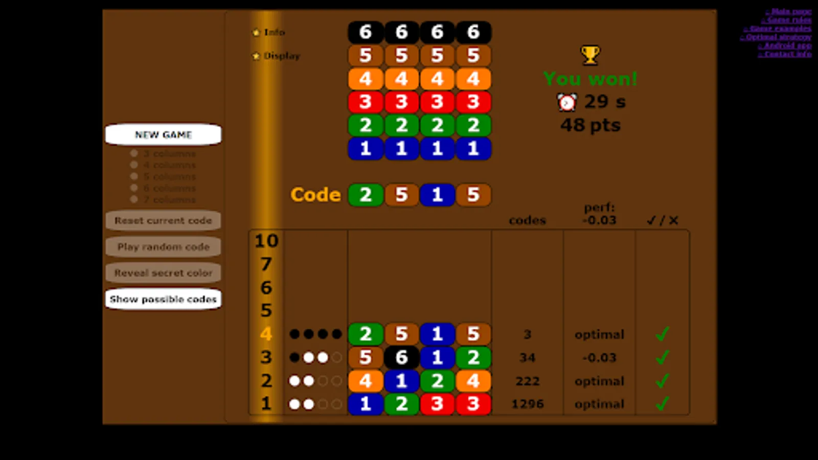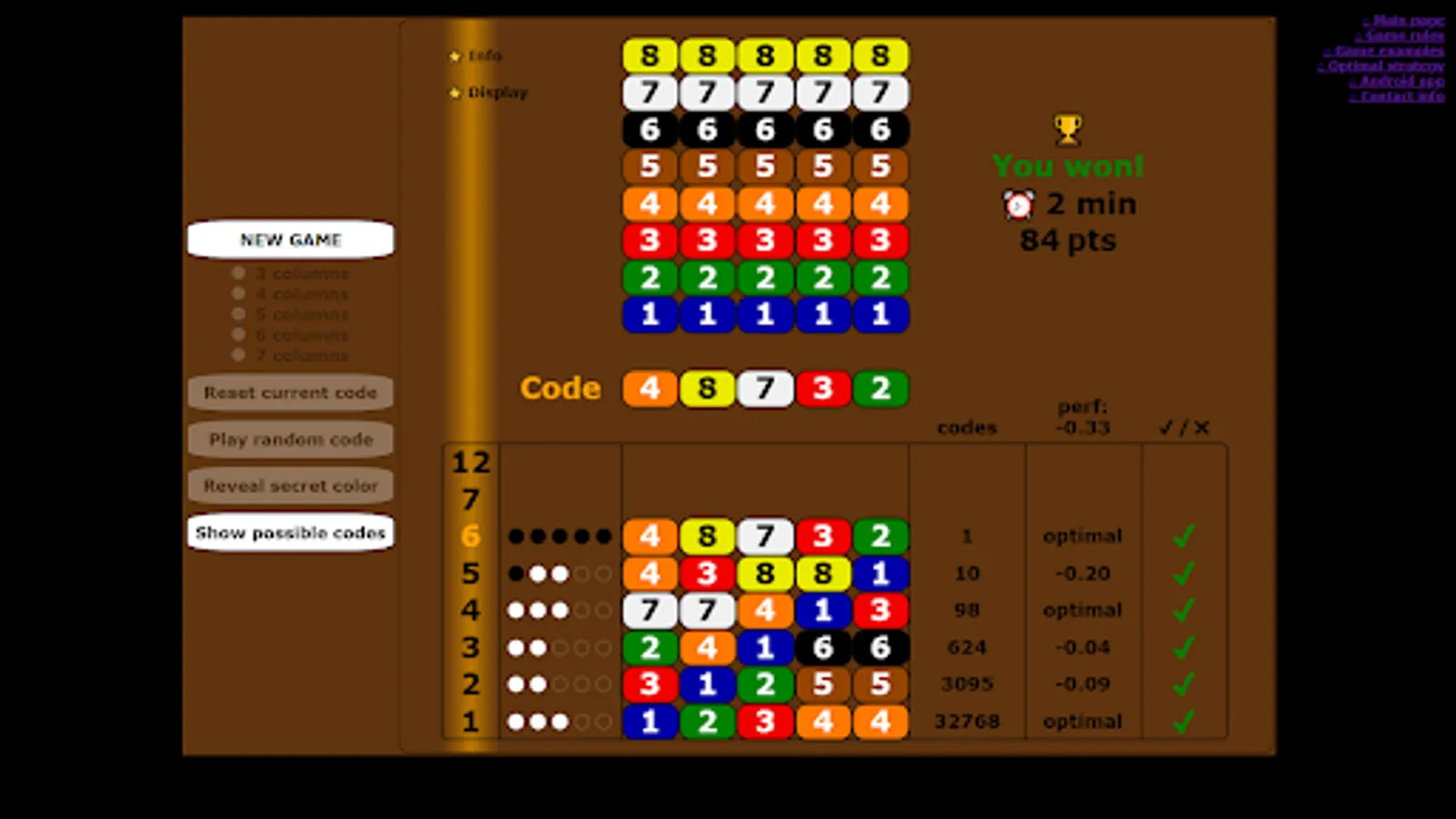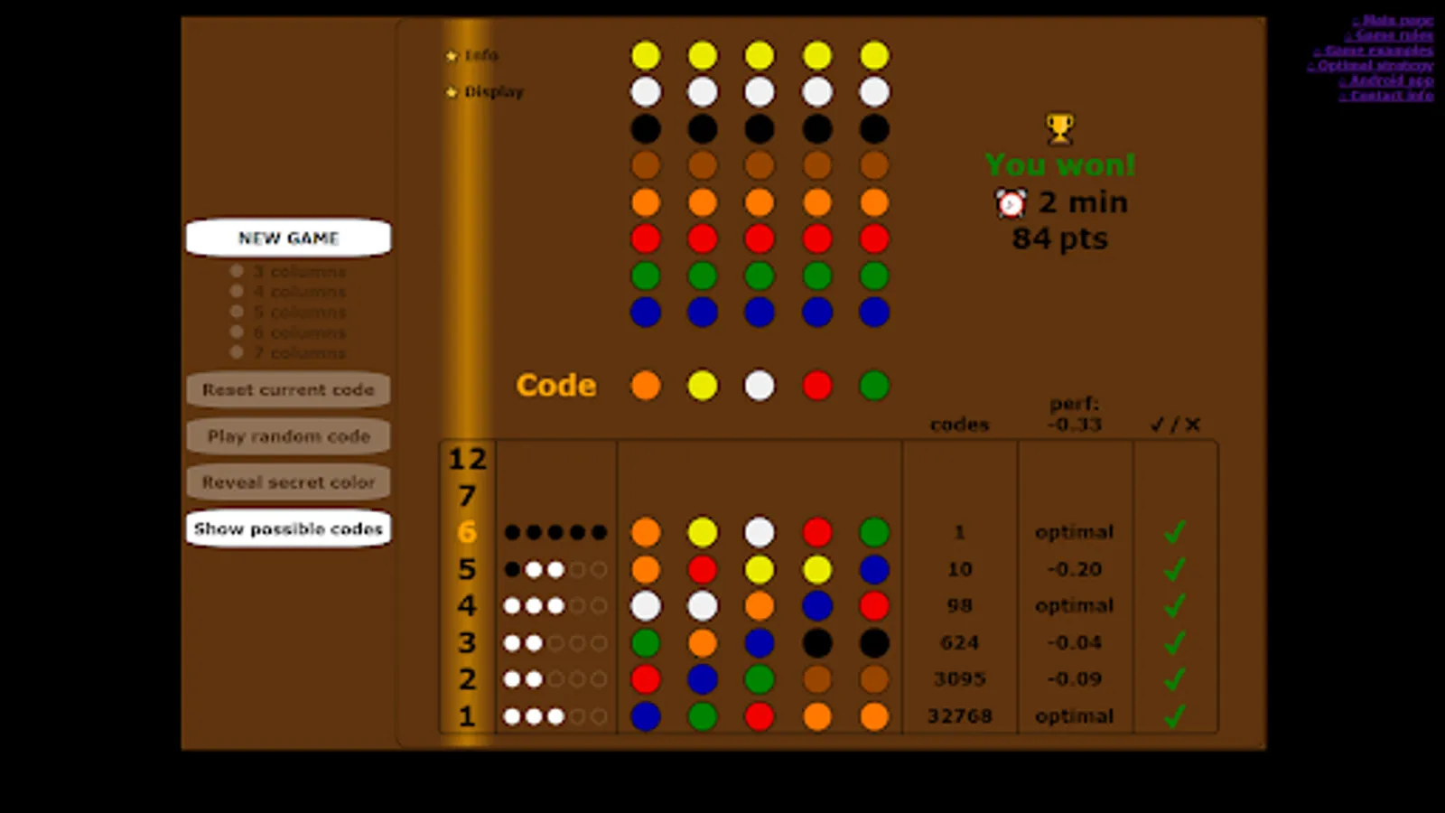 At each attempt, the number of possible codes is displayed, and the lists of possible codes are shown at game end.