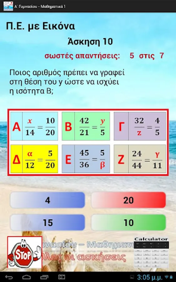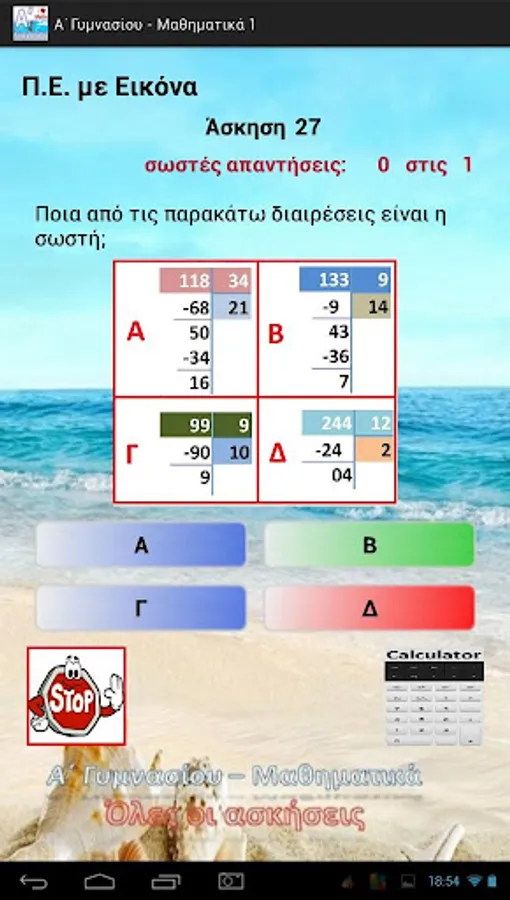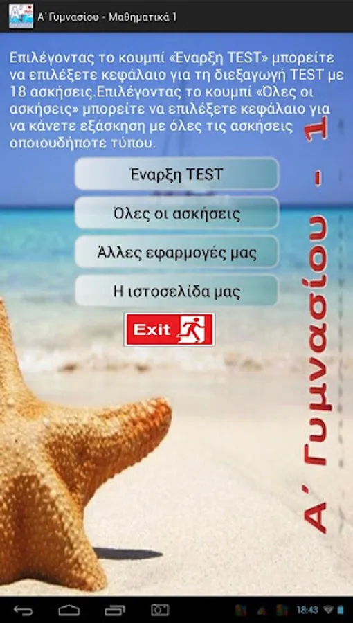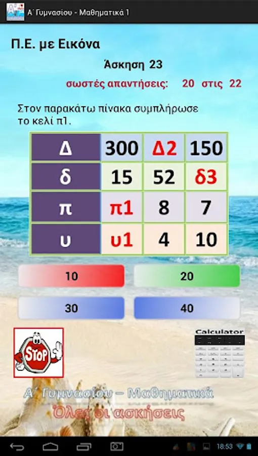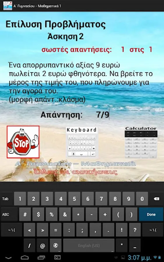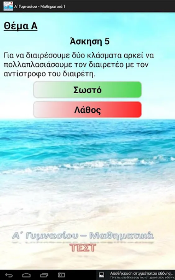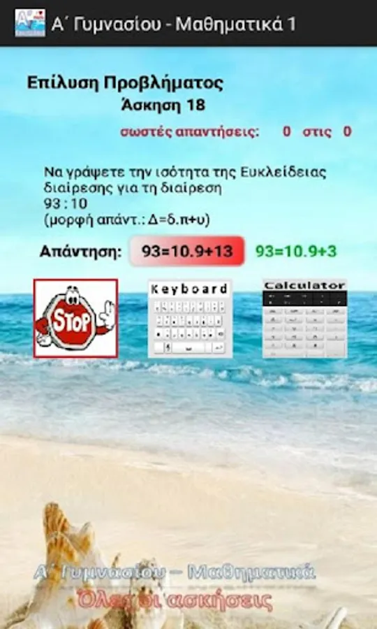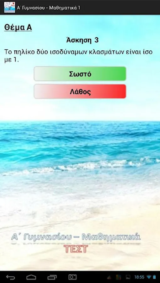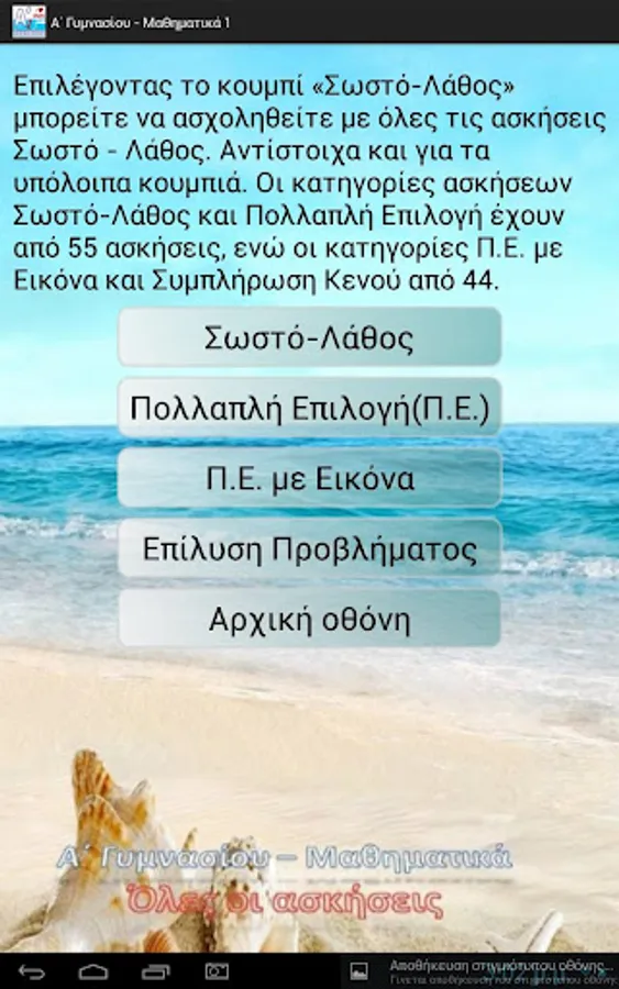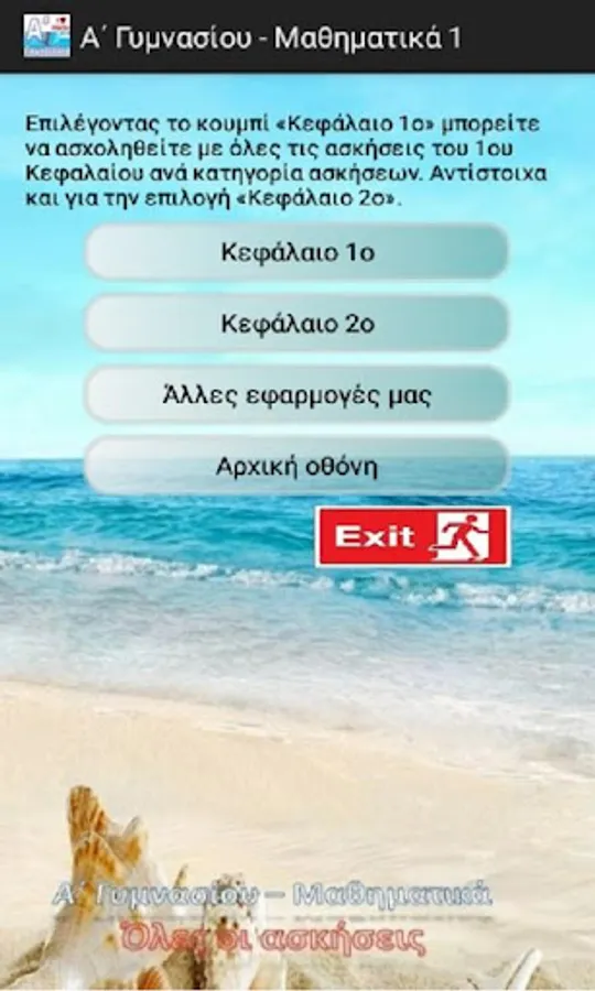 The student can repeat, practicing with the exercises of each class separately. It can deal with all exercises stored as True - False, or multiple choice exercises, etc., or as many as they want, since there is a STOP button to end the process. Because access in this case is serial, it is possible for the student to continue at some other time practicing the exercises, from where he stopped. In this case, the student can also use the built-in calculator if he needs to do some work. The exercises contained in this application thus cover all the curriculum from the following chapters of the textbook: