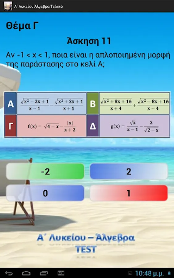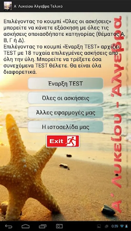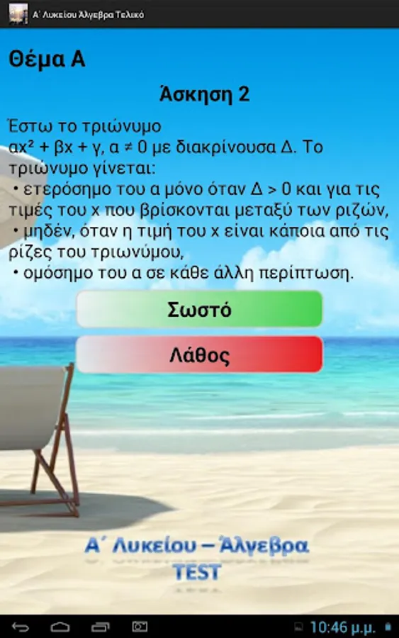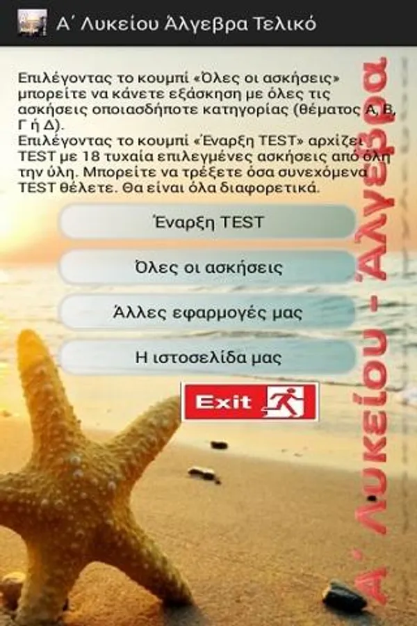 Apply for a last good replay at the Algebra of the 1st Lyceum. Ideal for school (tablet, hdmi, projector), tutorial, special, teacher, student. Repeat in Mathematics and with your tablet or mobile. Repeat with exercises in theory and exercise methodologies, in a pleasant and entertaining way. To identify the student and fill in any gaps he may have in his / her knowledge.