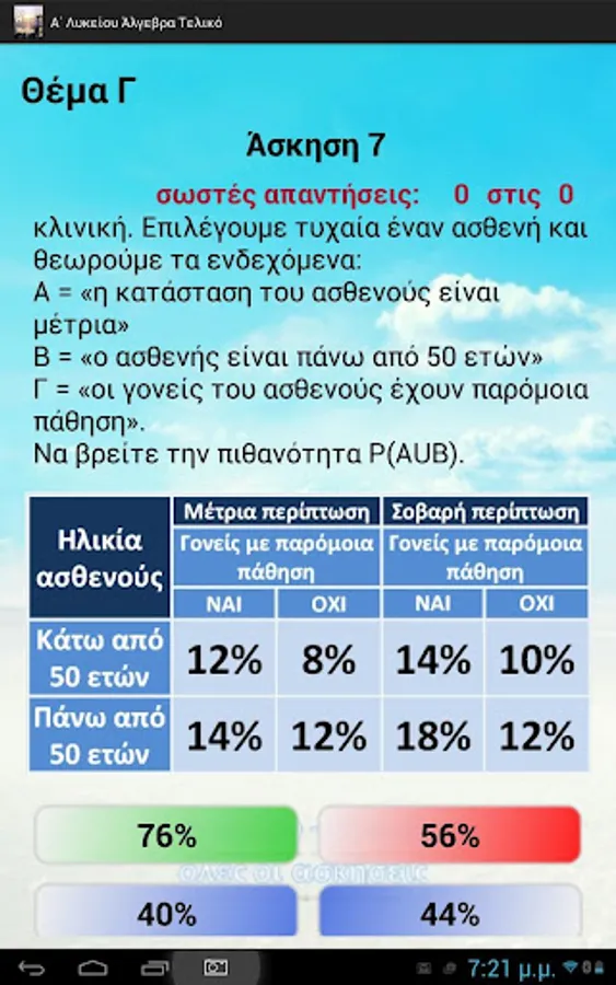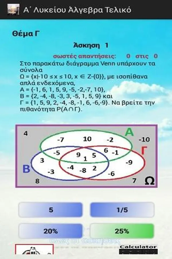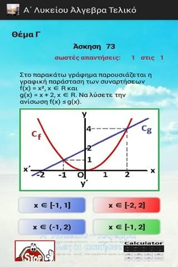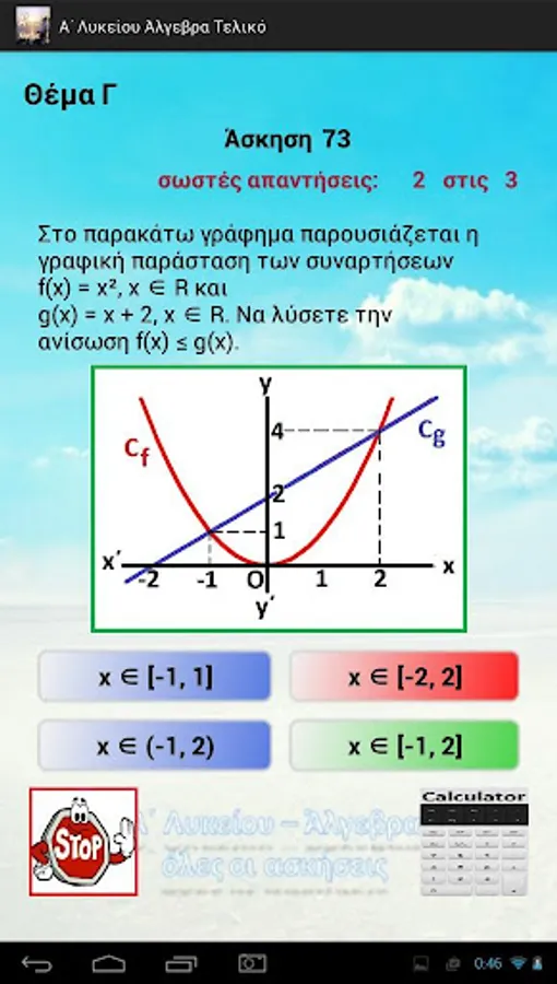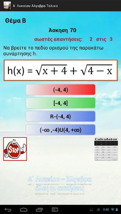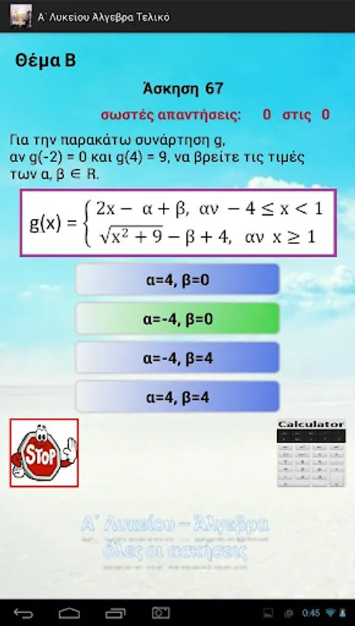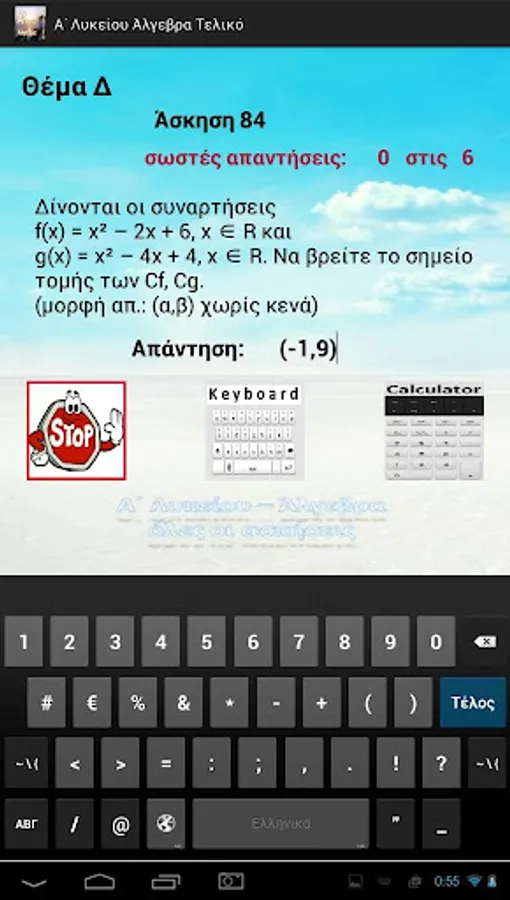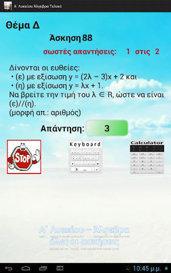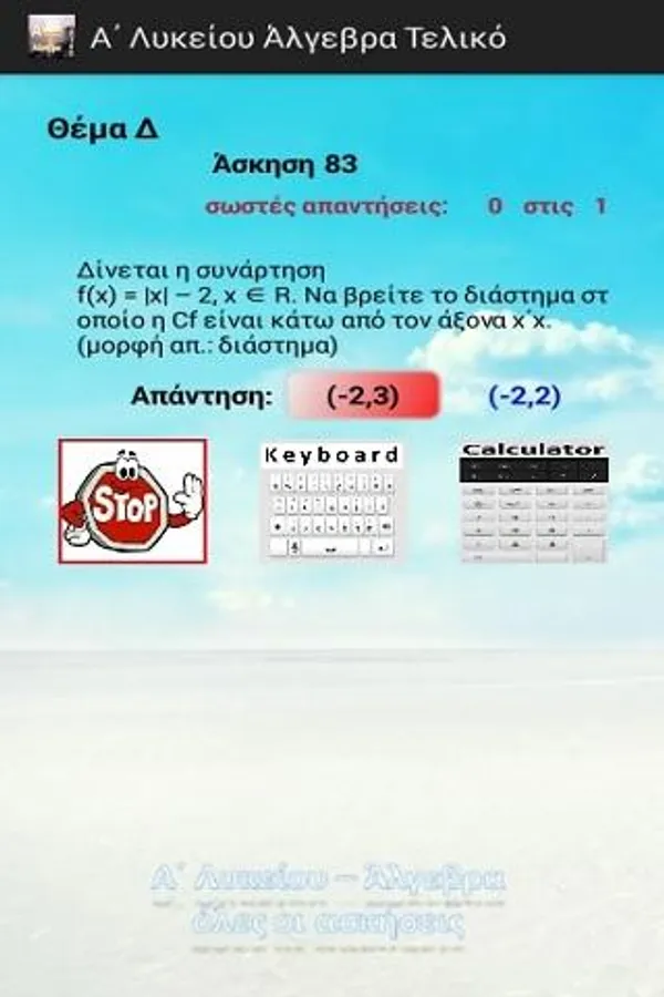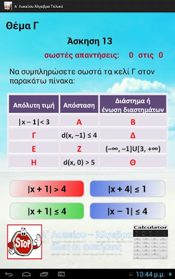 It is possible for the student to repeat, practicing with the exercises of each subject (exercise class) separately. It can handle all the exercises stored at the base, for example. as Topic A. All of the Correct-Wrong suggestions, or the exercises of Topic B, multiple choice, etc., or those who want it, since there is a STOP button to end the process. Because access in this case is serial, it is possible for the student to continue at some other time practicing the exercises, from where he stopped. So he can slowly take up all the exercises. In this case, the student can also use the built-in calculator if he needs to do some work.
